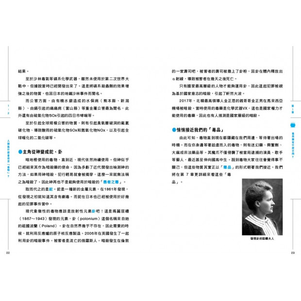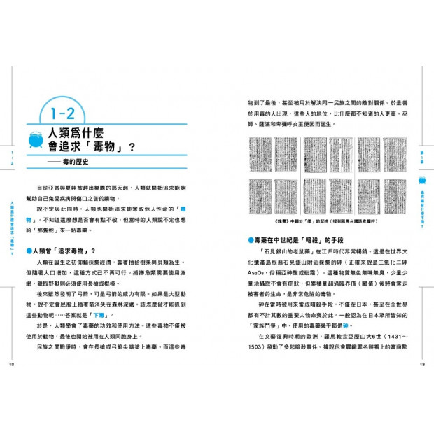 毒物就像毒草、毒蕈菇、毒魚,大量存在於自然界。不僅如此,也會像殺蟲劑或殺菌劑那樣隱藏於我們的家庭當中,有時甚至會躲上餐桌成為食物中毒的原因。本書將以淺顯易懂且帶有趣味性的方式,解說毒與藥的差別以及化學上的相似性,使各位讀者能更廣泛地瞭解毒物與藥物的世界。請務必閱讀本書,成為「毒與藥的專家」吧!
