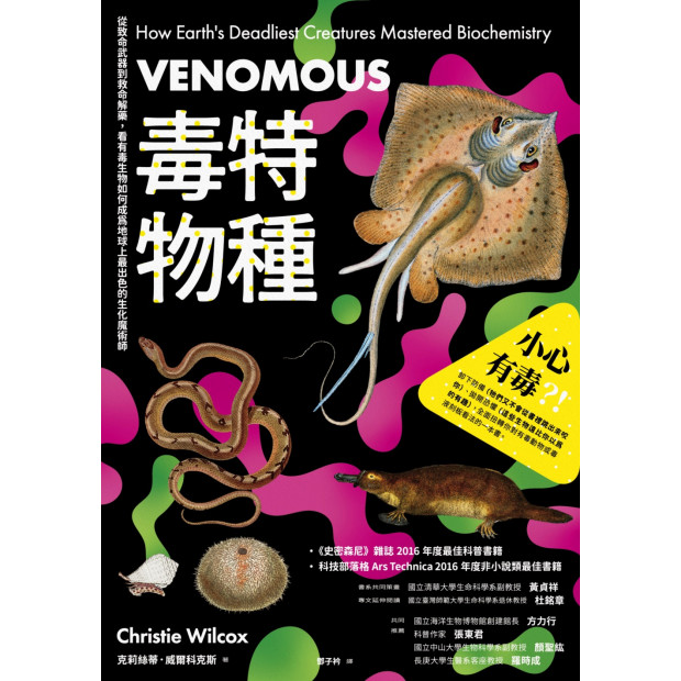 作者在說故事的過程中,平順而合理地置入多種原本可能令人望之卻步的科學知識,包括化學分析、細胞分子生物學、生物化學、免疫學、神經科學、藥物動力學、人體生理學等專業科目。讀完本書,讀者將會發現有毒生物在生態系統中和人類同樣占有關鍵性角色,也會扭轉對有毒動物或毒液的刻板看法,能更全面地看待這些與人類息息相關的生物。