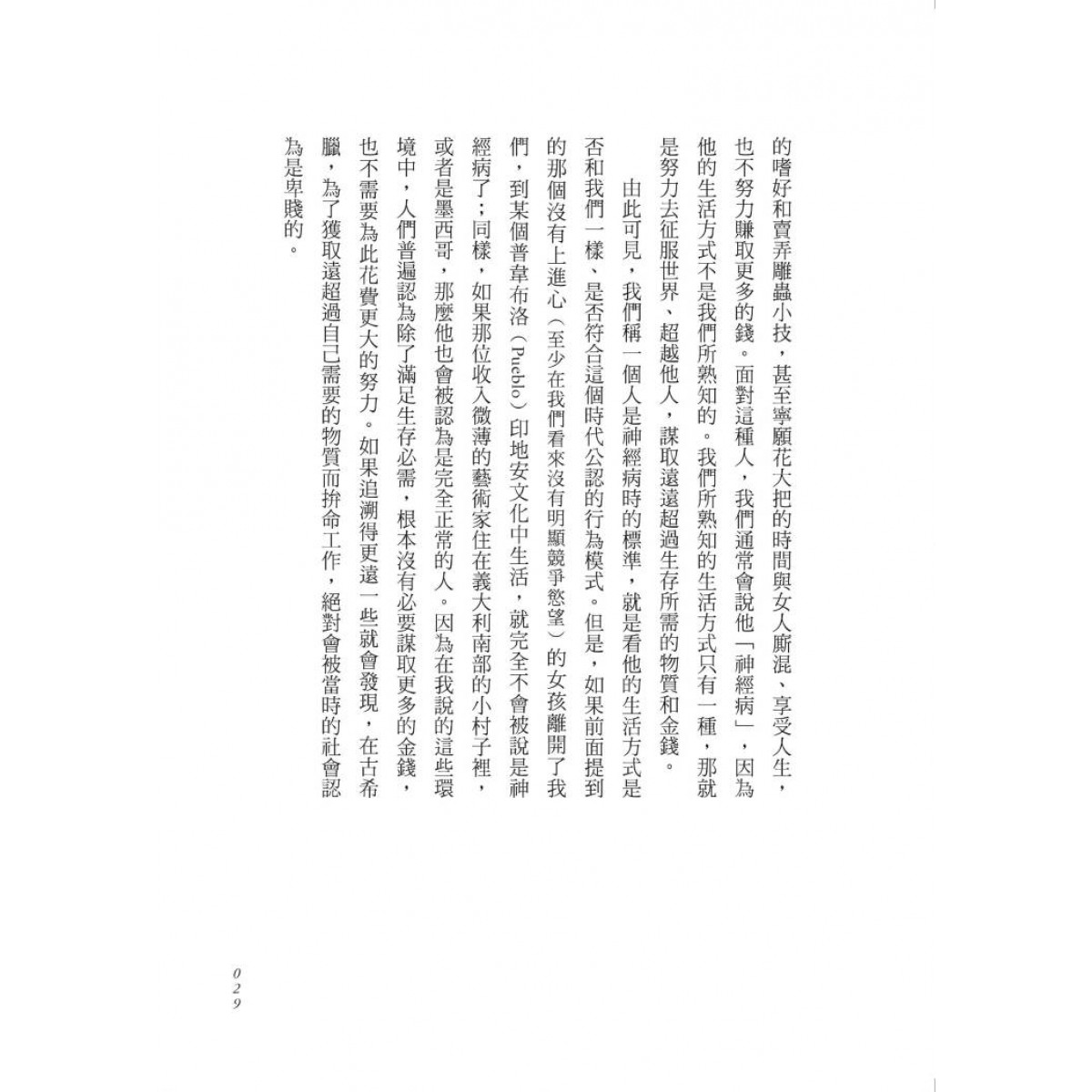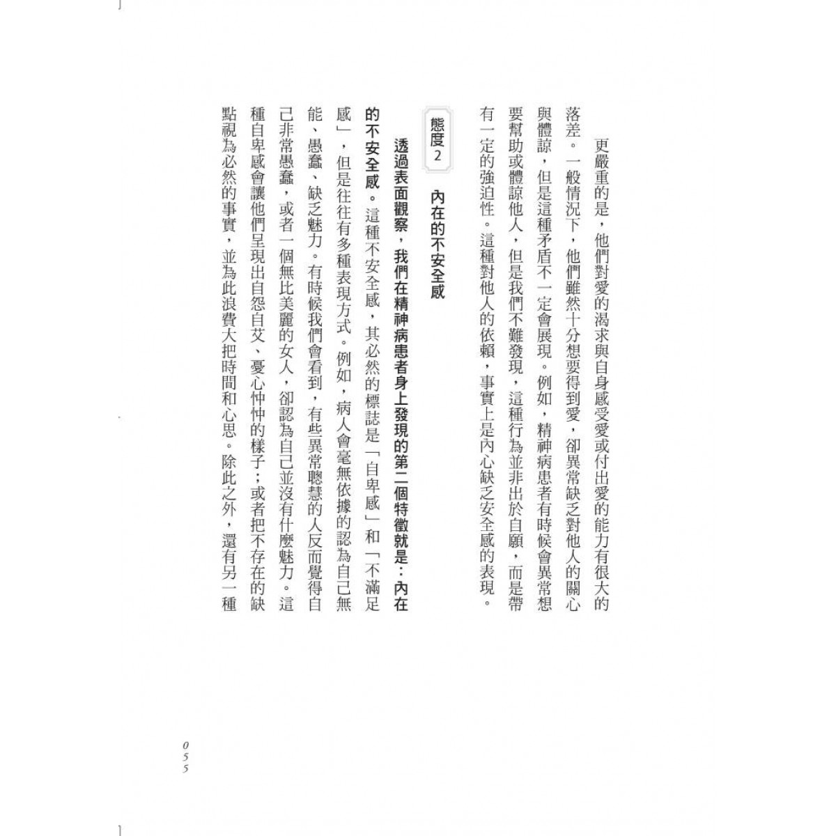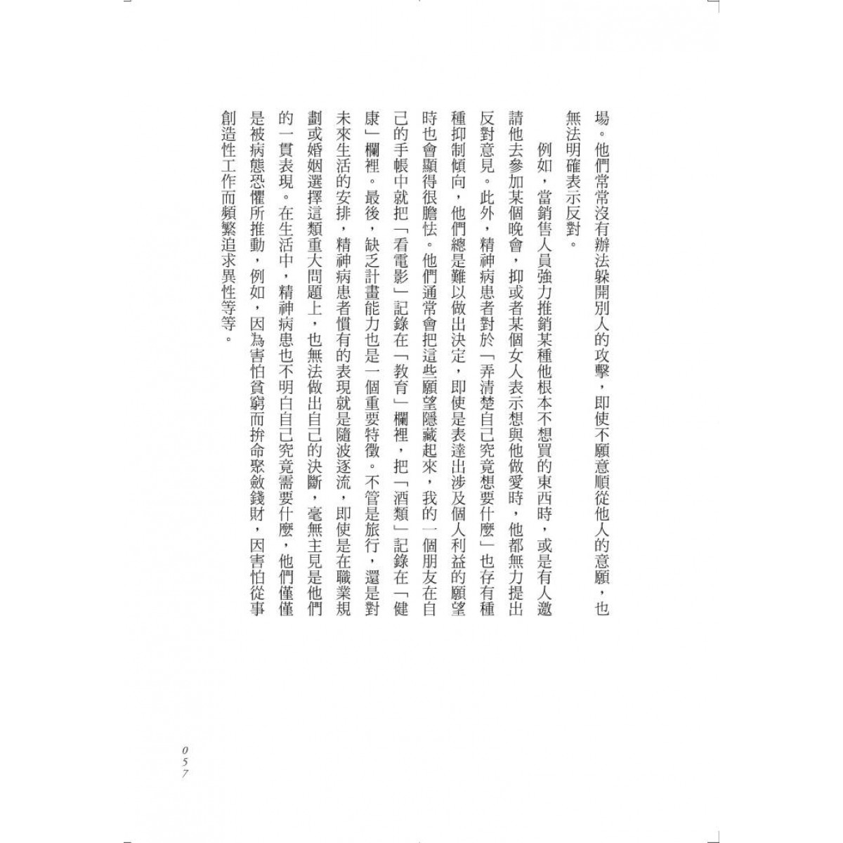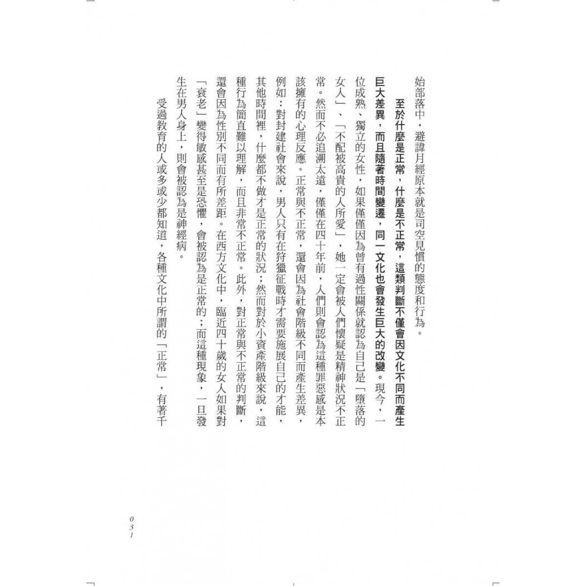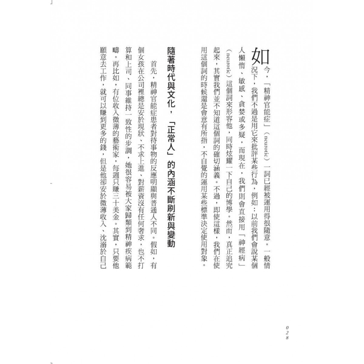 什麼是「正常」,什麼是「不正常」,這類判斷不僅會因文化不同而產生巨大差異,而且會隨著時間的變遷,同一文化中也會發生巨大的變化。焦慮、痛苦、內心的衝突,以及人際交往障礙在書中完整呈現。我們會發現,「精神疾病」不單單指個人的身心狀態,而是整個社會所賦予的精神狀態。我們遊走於「正常」與「不正常」之間,自卑、壓抑、嫉妒、恐懼、愛慕虛榮、貪圖權利……究竟是我們需要被治療?抑或是整個社會需要被改變?