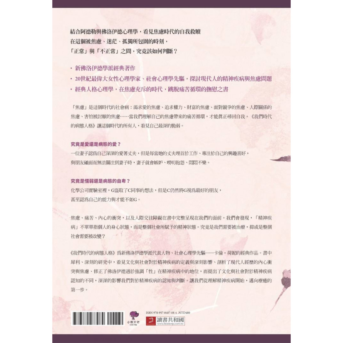 「焦慮」是這個時代的社會病:渴求愛的焦慮、追求權力、財富的焦慮、面對競爭的焦慮、人際關係的焦慮、害怕被討厭的焦慮……當我們理解自己的焦慮帶來的痛苦循環,才能真正尋回自我。《我們時代的病態人格》讓這個時代的所有人,看見自己最深的脆弱。