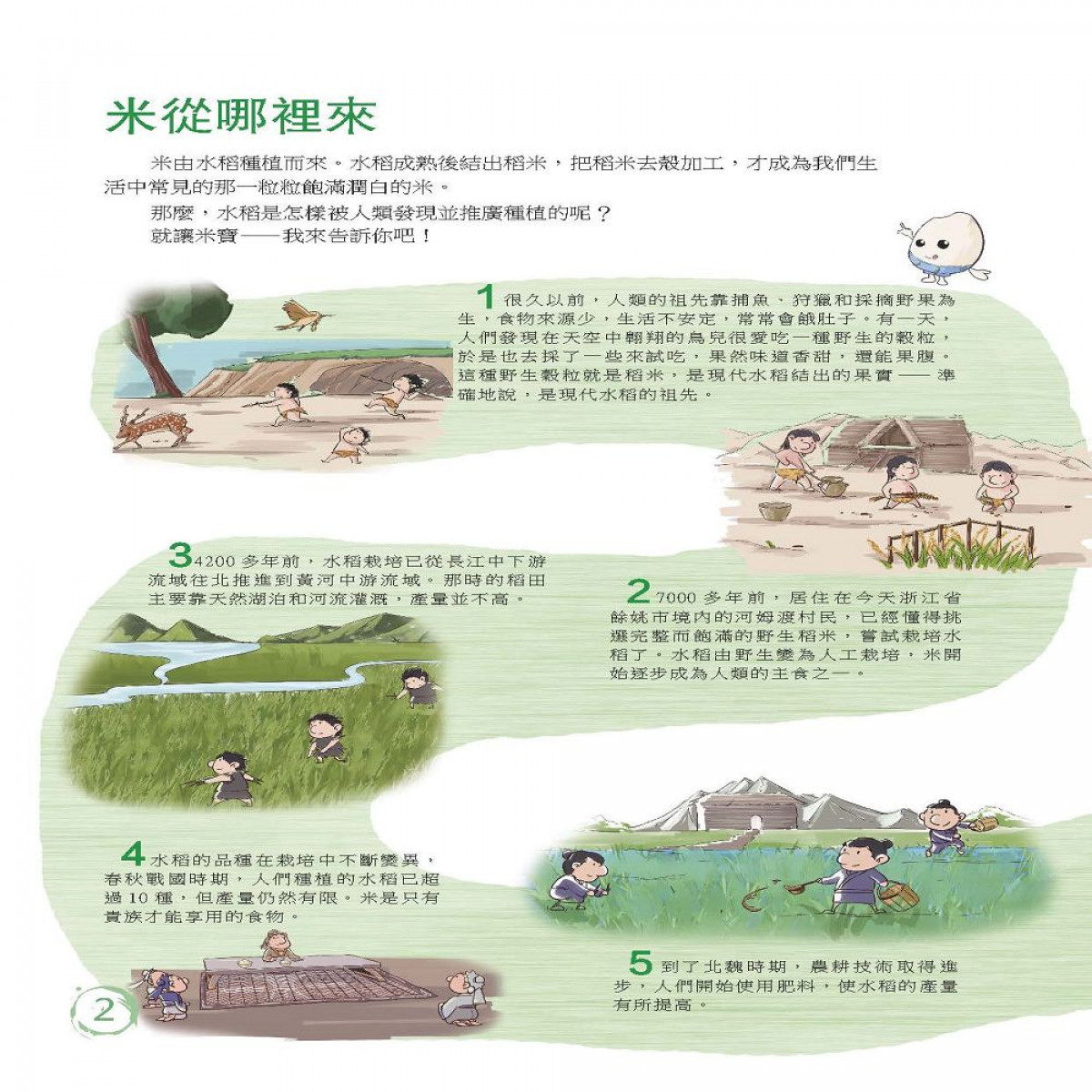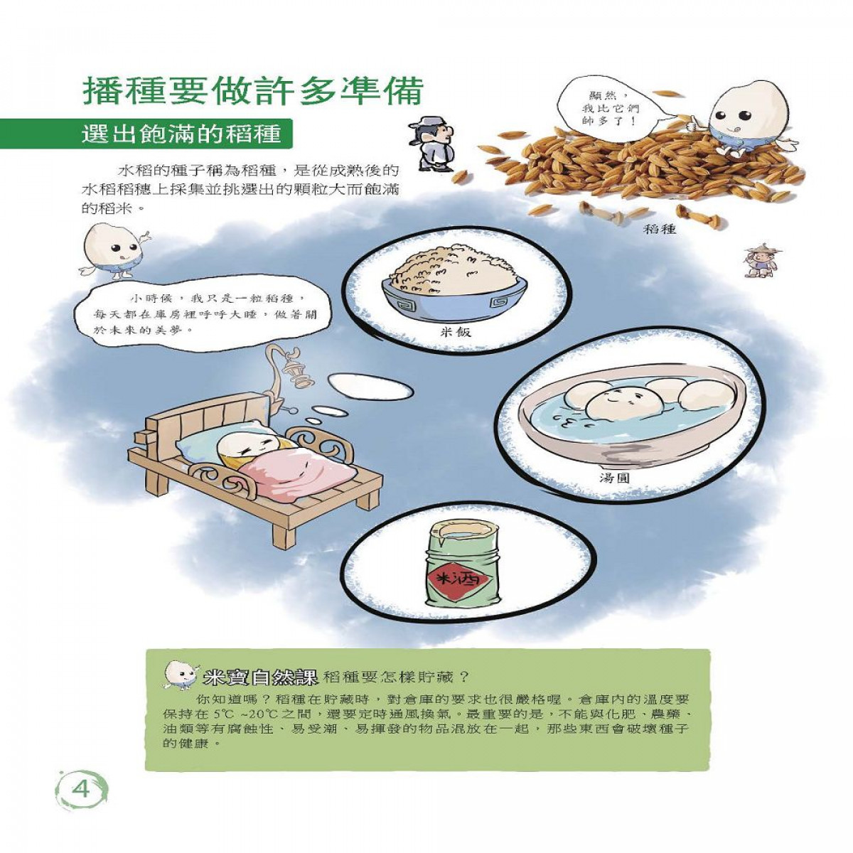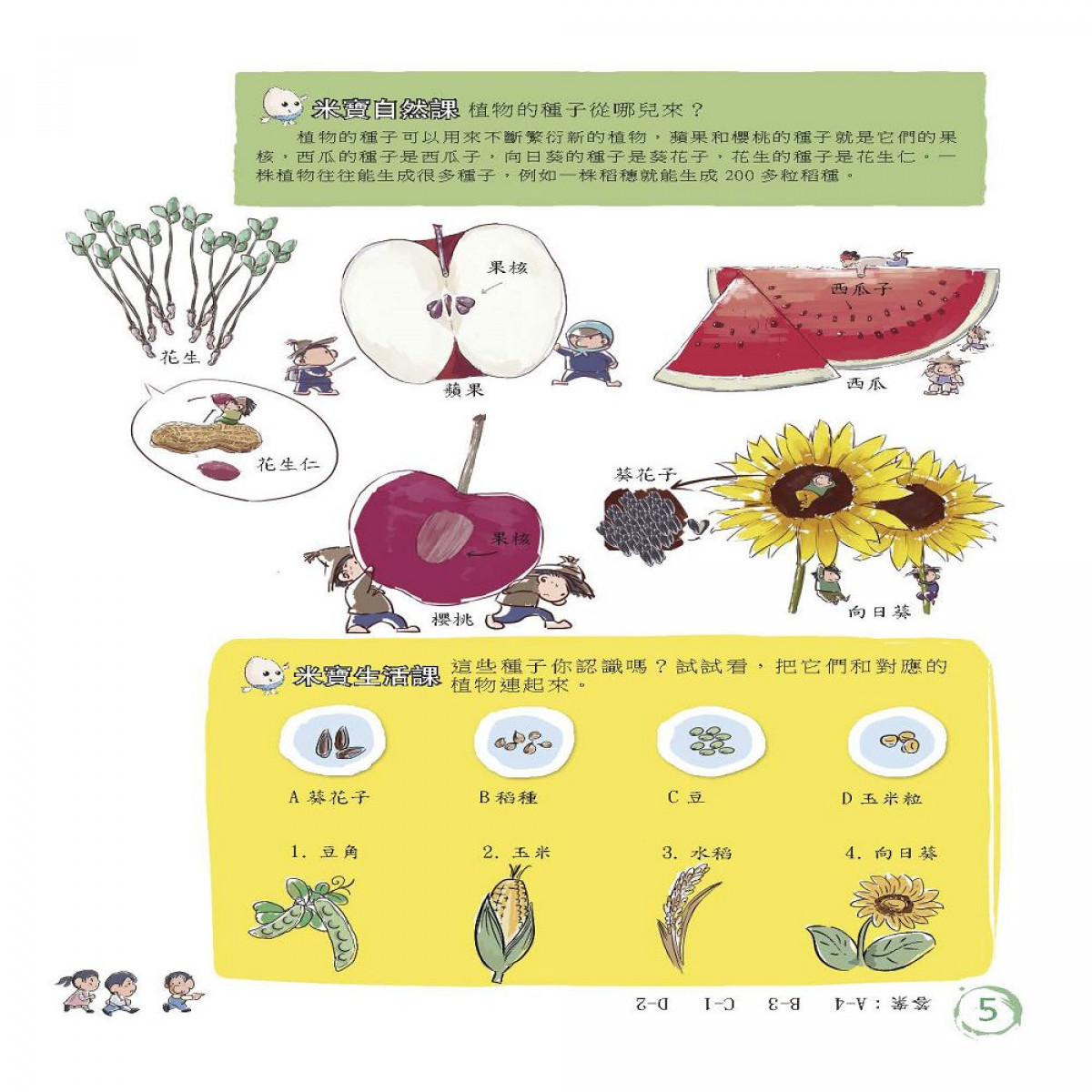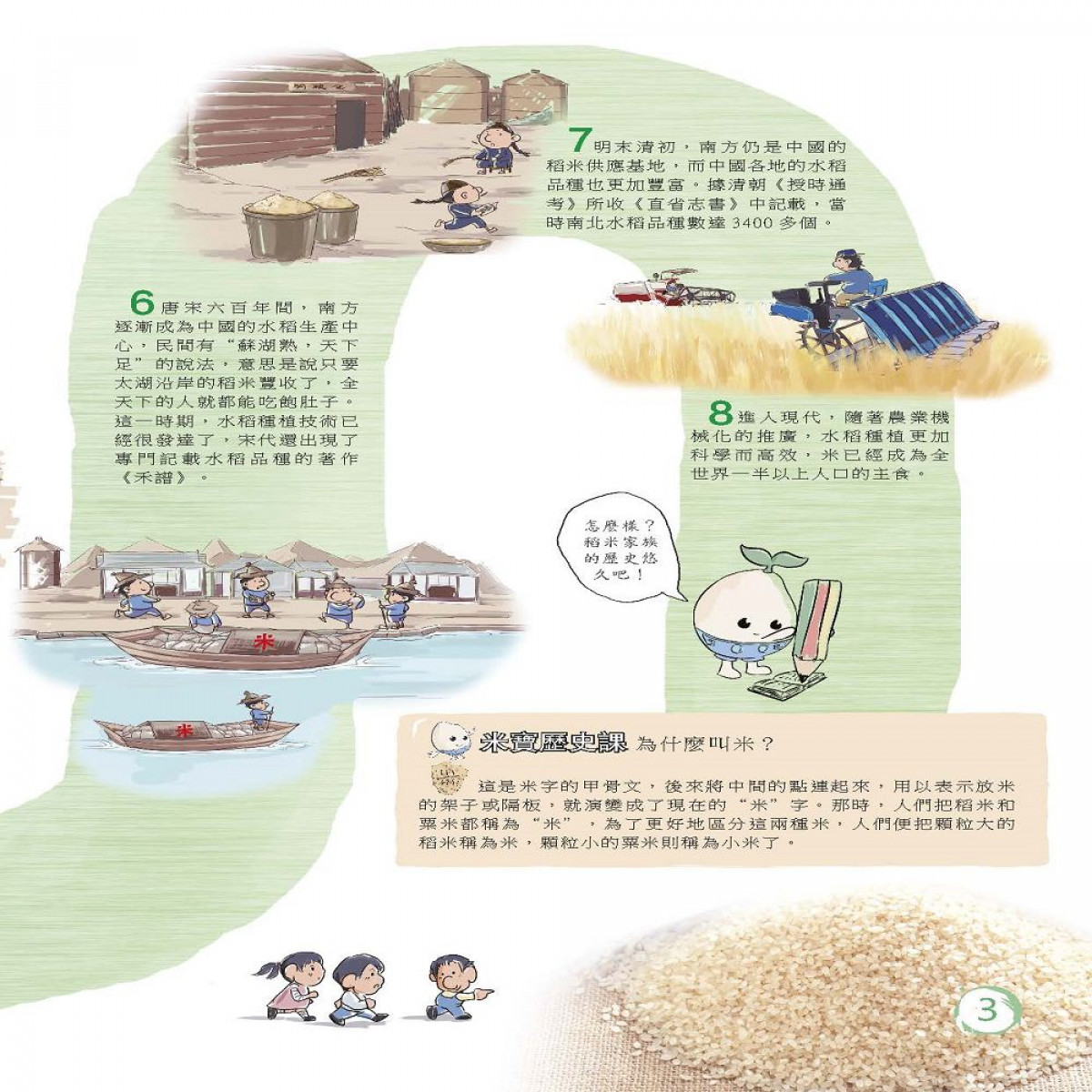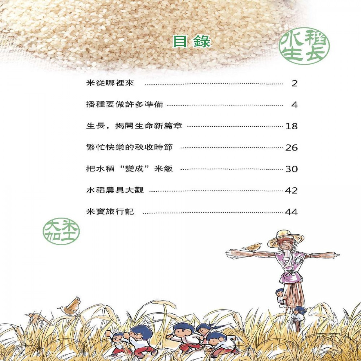 本集主題為「米」。每個人幾乎每天都會進食米飯,但用餐時是否想過為何古時會說「誰知盤中餐,粒粒皆辛苦」?到底農夫從播種,插秧至秋收花費了多少心思汗水?什麼是育苗?什麼是犁田呢?而水稻長成又要多少天?收成的稻米是否就可以直接煮成米飯呢?有什麼原因會影響收成?在品嚐用米製成的湯圓、粽子、壽司等美食時怎麼可以忽略萬物的由來?只有了解常識,通曉文化才是真正教育孩子的不二法門。