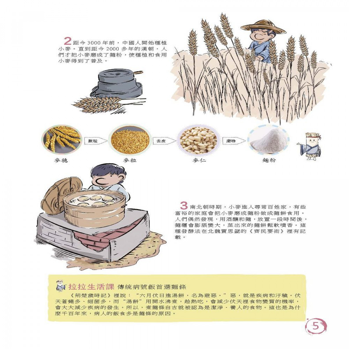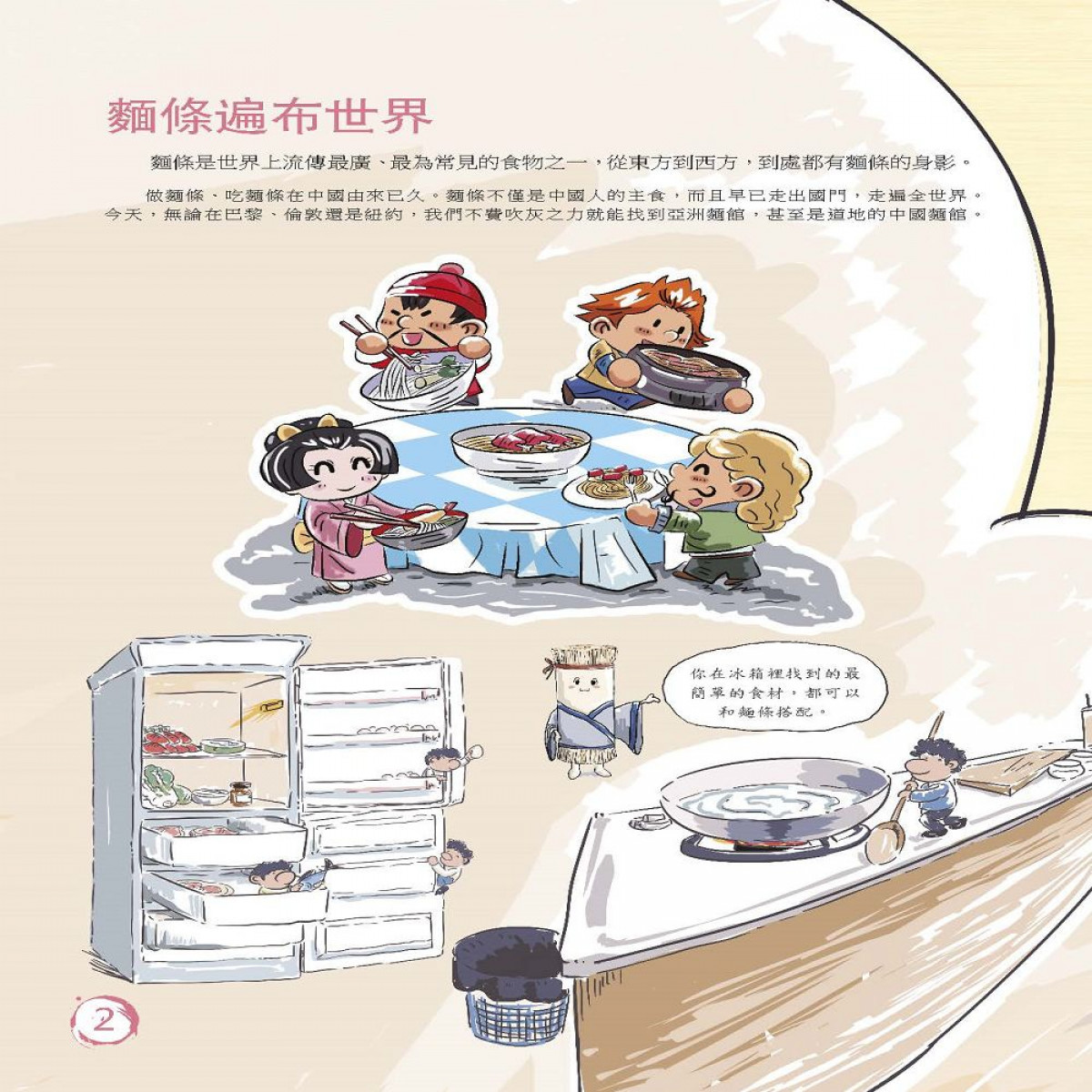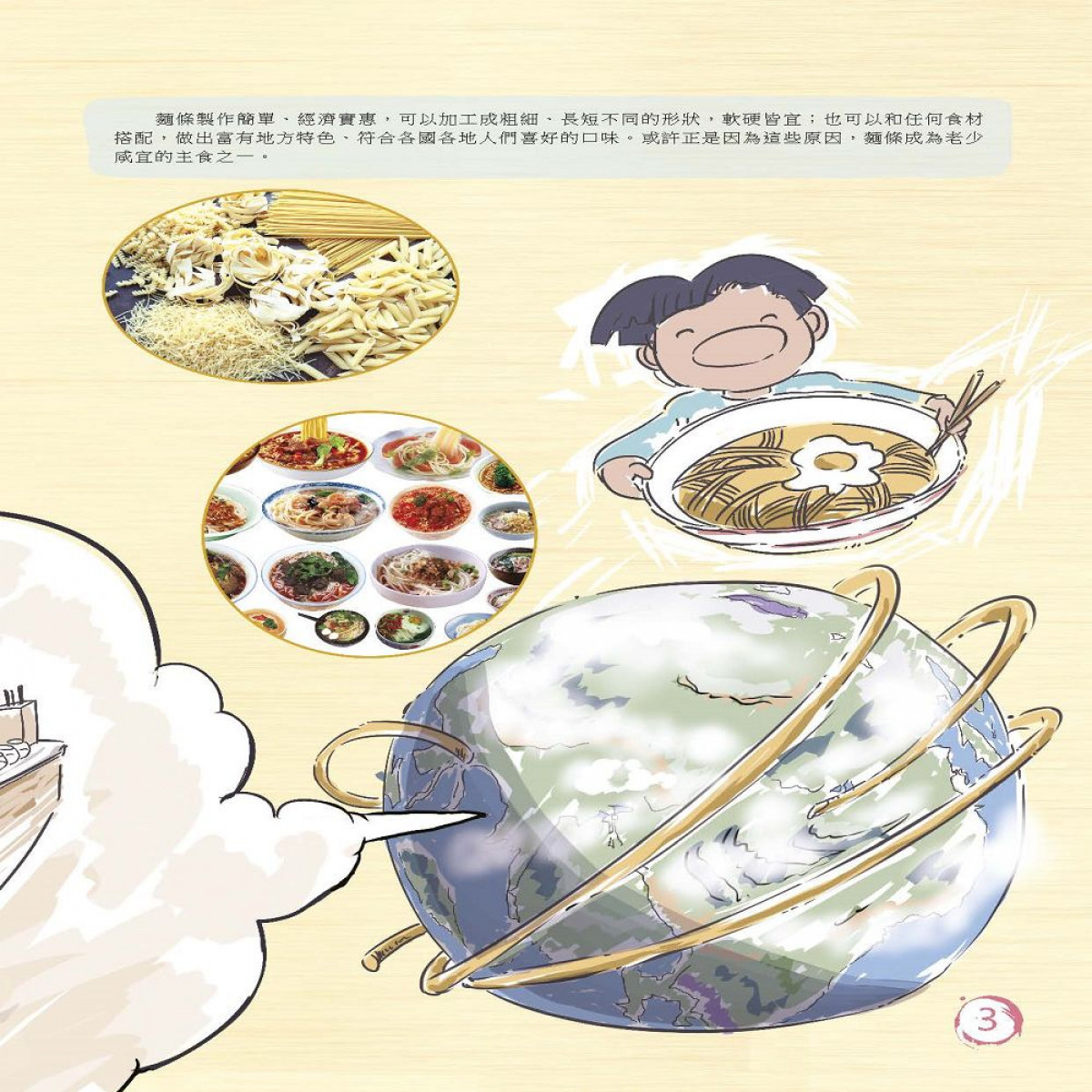 本集主題為「麵」,人們普遍認為華人是米食文化,但其實麵食也有著同等的飲食地位。大家都知道麵由麵粉製成,但是否知道按材料可分為小麥麵條跟澱粉麵條呢?麵的風味在華人料理中竟然有1200種?刀削麵、陽春麵、麵線、米粉、粉絲,每個人家中又有多少種麵條?意大利麵、烏龍麵、冷麵都是學習中式麵條而來的?麵條是否只有長條型?現在社會創意無限,綠茶麵、蔬菜麵,將來會想出什麼新意?麵條看似簡單,卻蘊含著世界各國飲食文化的巧思,大家最愛那一種麵食呢?只有了解常識,通曉文化才是真正教育孩子的不二法門。