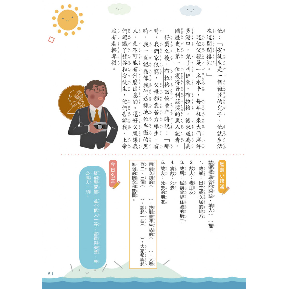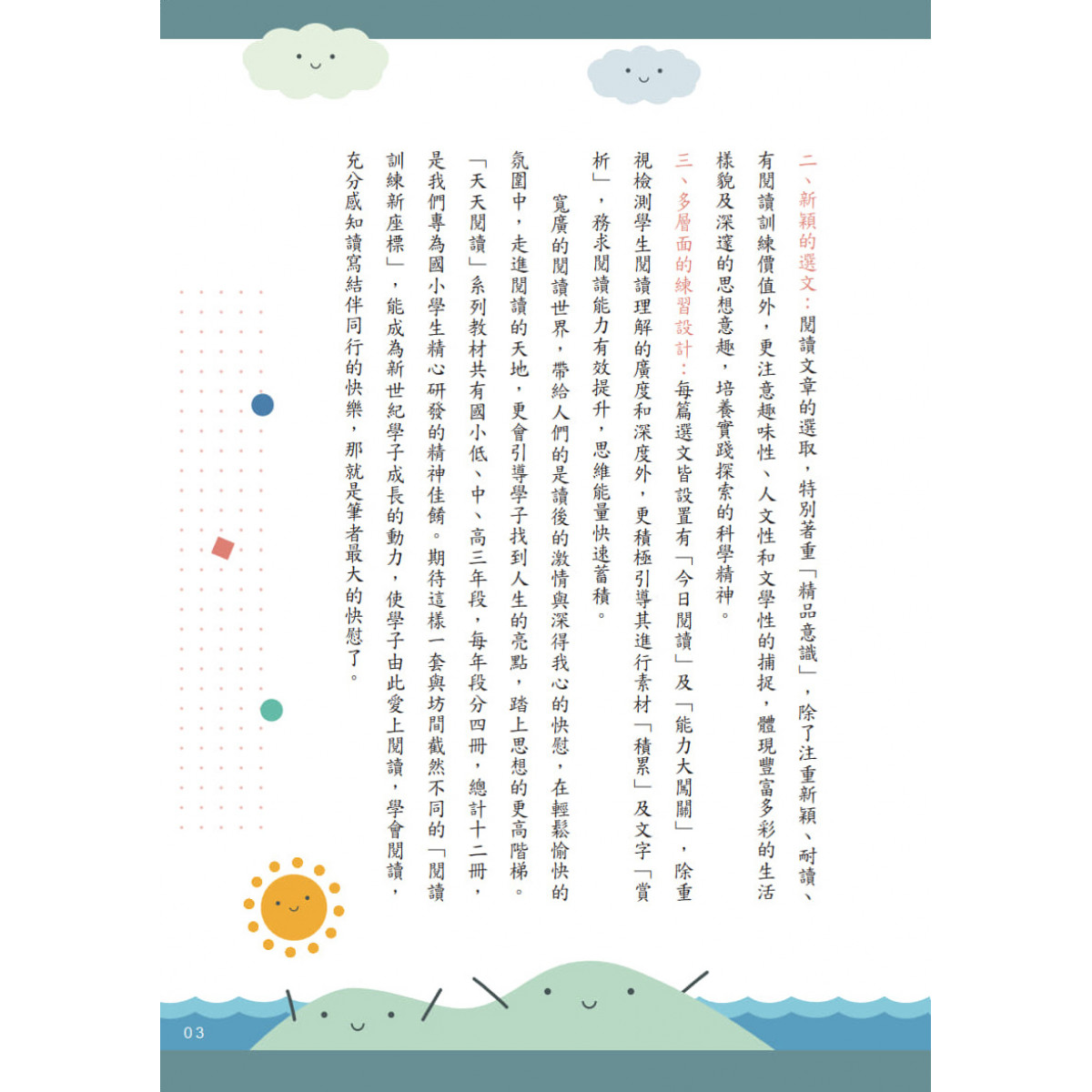 這套叢書,共分12冊,每個年段4冊,每冊皆設置有「今日閱讀」、「今日練習」、「今日名言」三大欄目。「今日閱讀」選文力求短小精悍,豐富有趣,旨在引導孩子親近知識,享受知識的美妙和歡愉;「今日練習」是針對選文所作的能力鍛鍊,其中包括有「能力大闖關」、「智慧小撲滿」、「思考檢測站」三部分,是引領孩子汲取選文精華,磨利讀寫技巧的「練功房」;「今日名言」則是選取與選文精神相通的名家金言,期盼由此更能強化孩子心靈的陶冶。