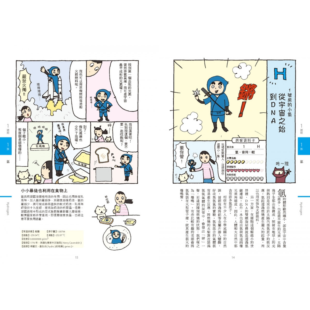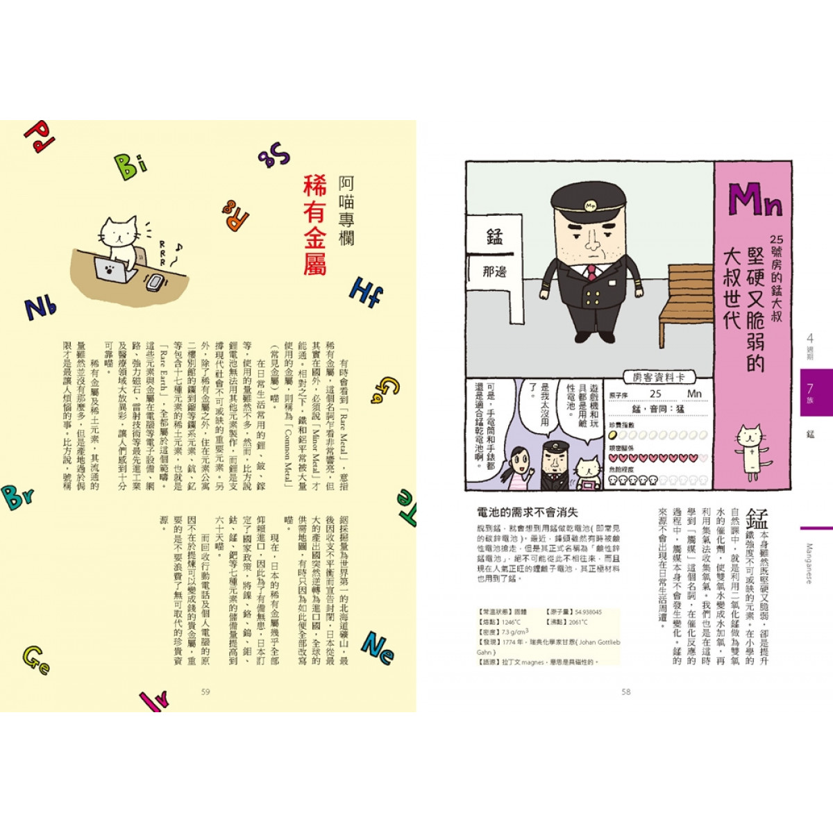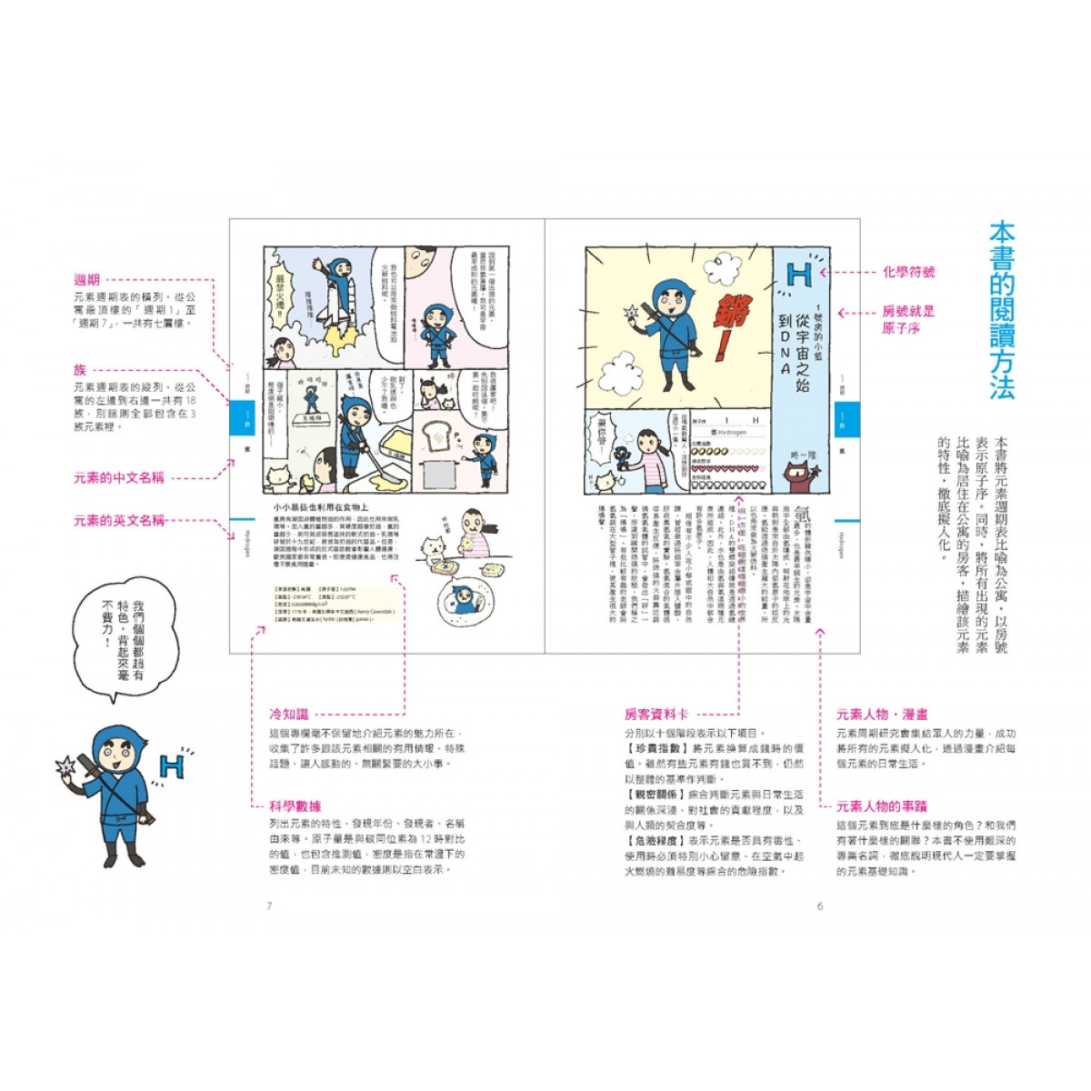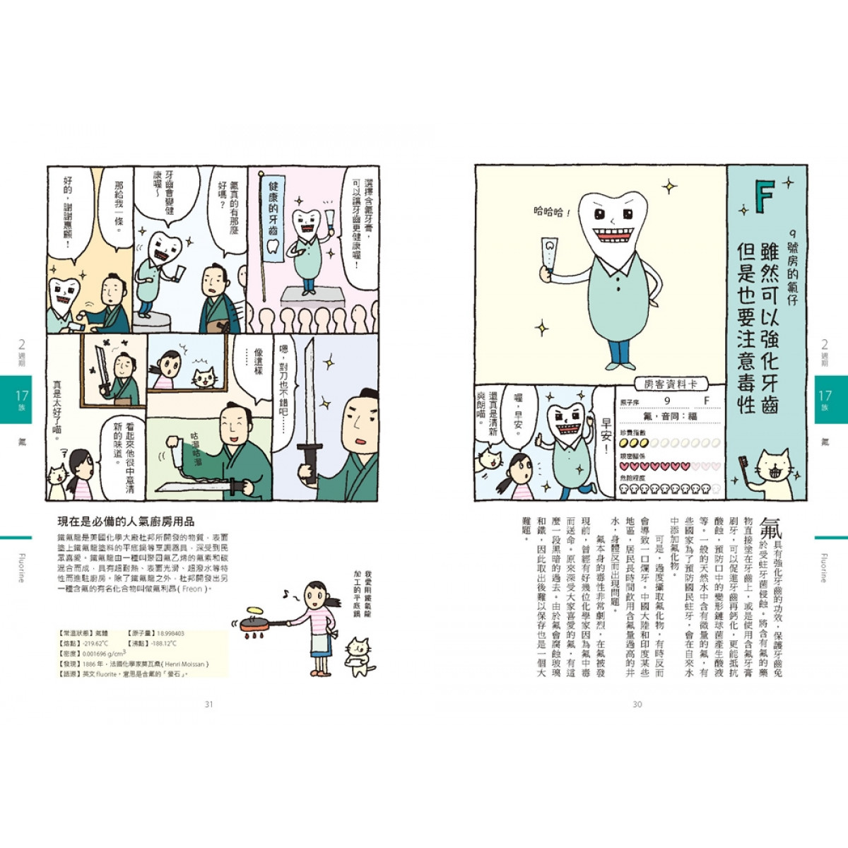 本書將元素週期表化作118個元素居住的原子公寓,而每個元素依照不同的特性,化身成可愛萌角,藉由漫畫演出自己的故事。