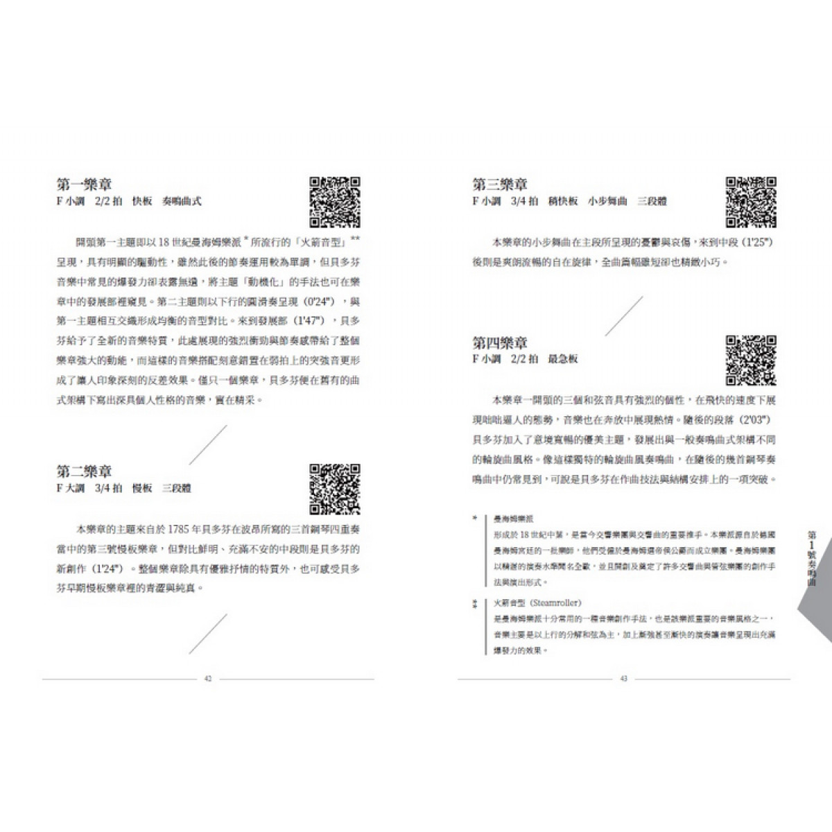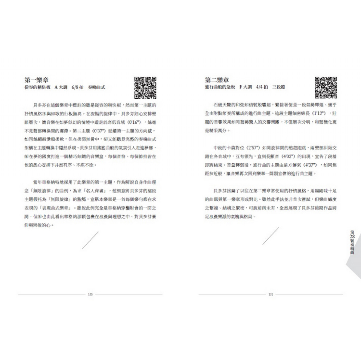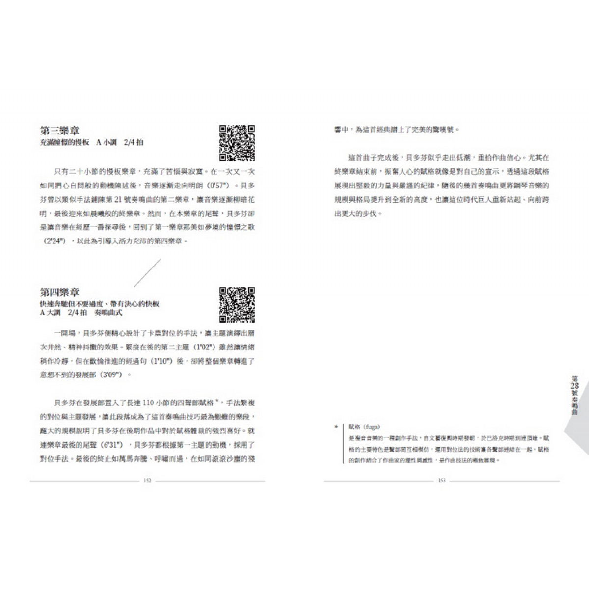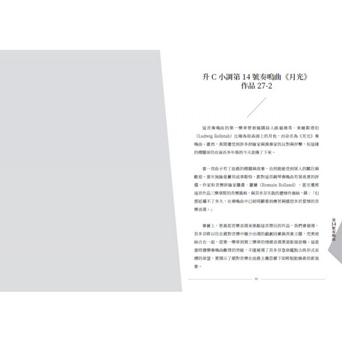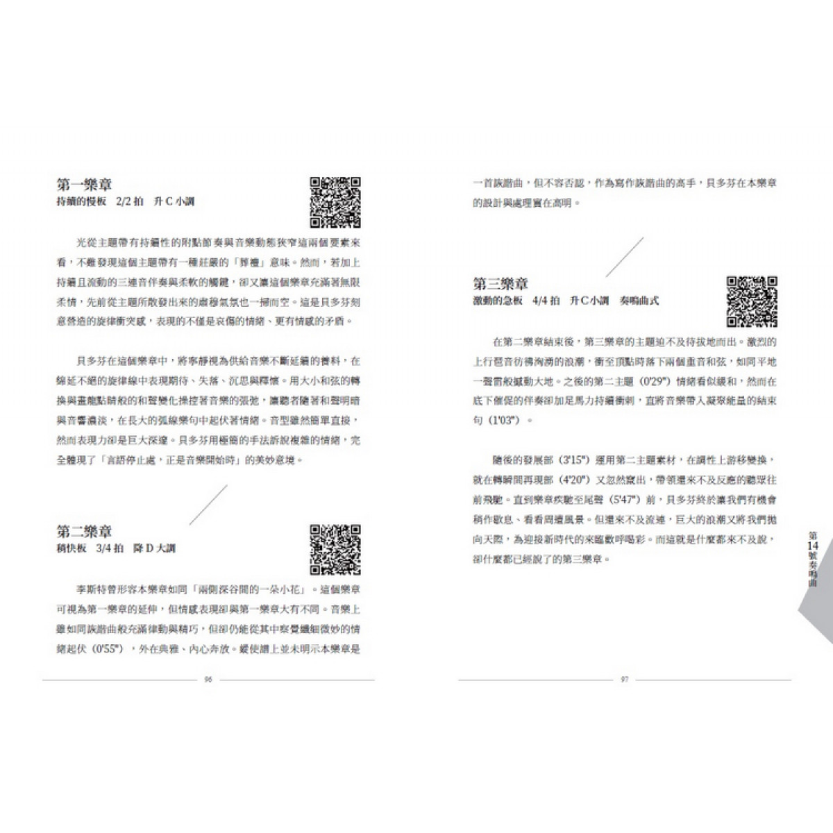 和一般音樂欣賞的書籍不同,作者在剖析貝多芬32首鋼琴奏鳴曲時,結合了當今最流行的Spotify線上聆聽,每一個樂章的轉折處,都有時間點標示,讓你在聆聽樂曲時,更能精確感受到貝多芬的藝術巧思、人生思考。想要進入風格多變的貝多芬鋼琴奏鳴曲,這本書絕對是你最佳的聆聽指南。