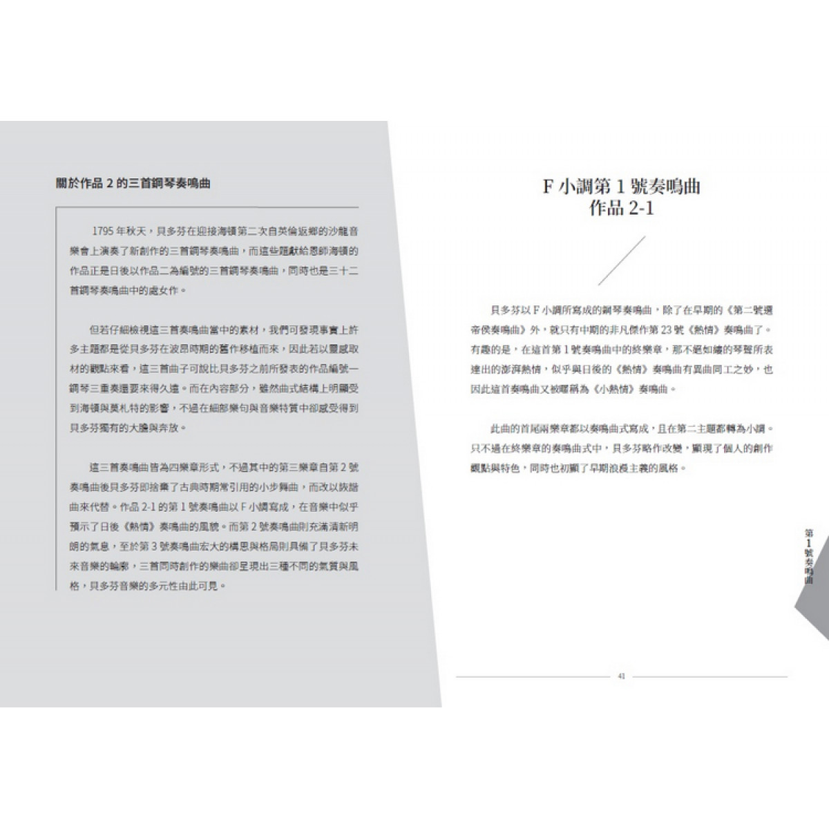 這本書有呂岱衛對每首奏鳴曲、每個樂章極為精闢的分析,他把自己建構在腦海裡的聆聽藍圖化為文字上的指引,讀者可以跟著他標記的音軌時間點,聽到樂曲的重要脈絡,搭配Spotify更快串起音樂的記憶點,走到深刻賞析的彼岸。——blue97 《Muzik》專欄主筆