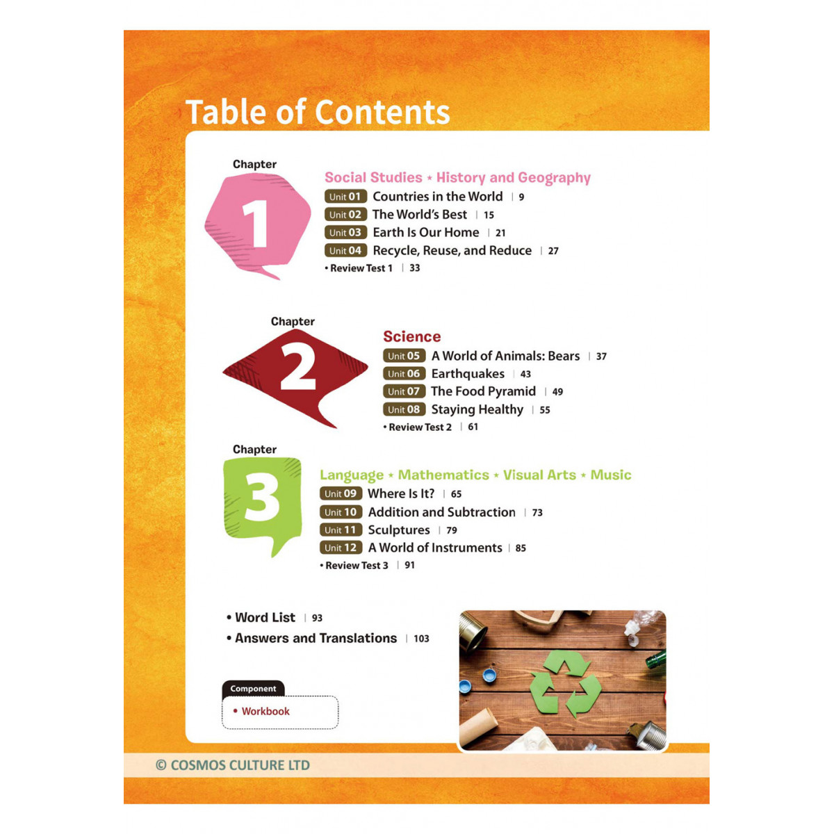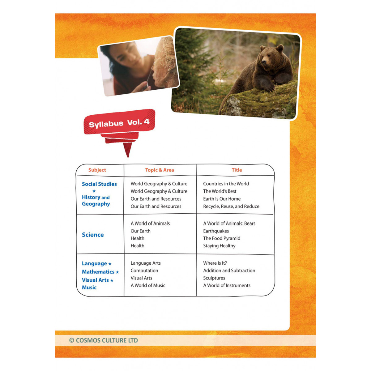 著重於世界地理與人口、地球資源與永續,動物習性、天災與健康保健,以及位置描述、加減算術與藝術、樂器等。