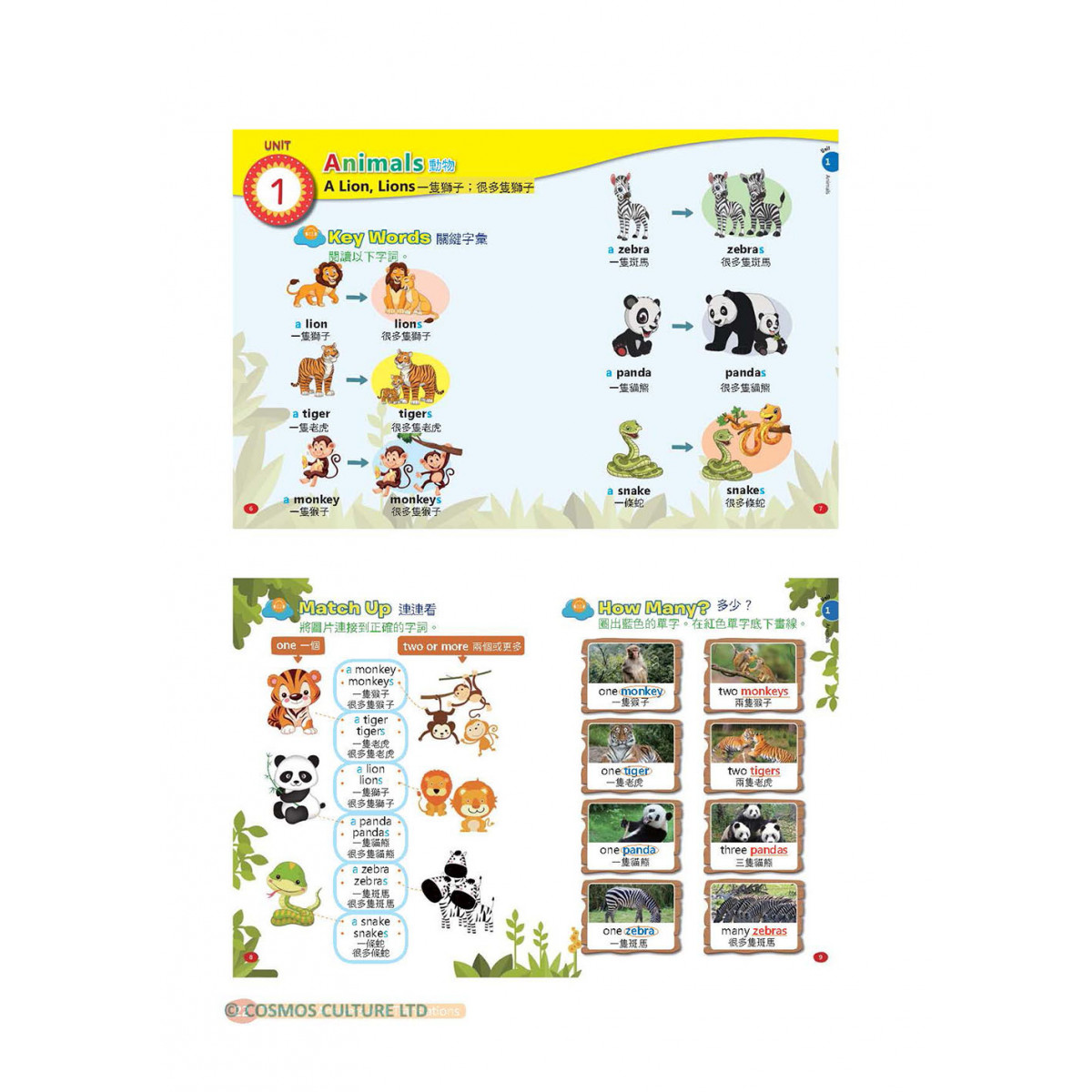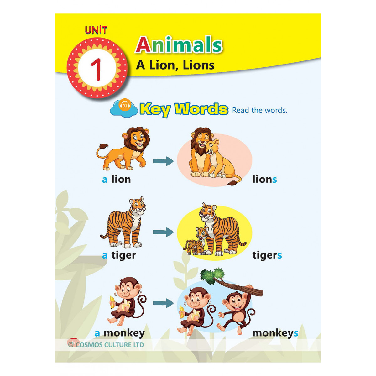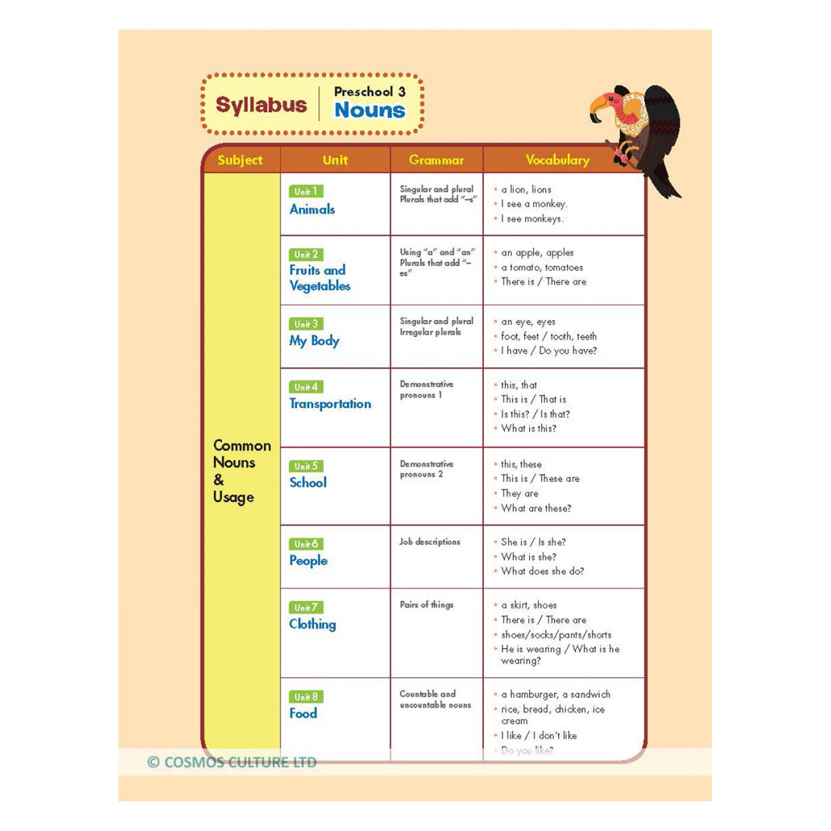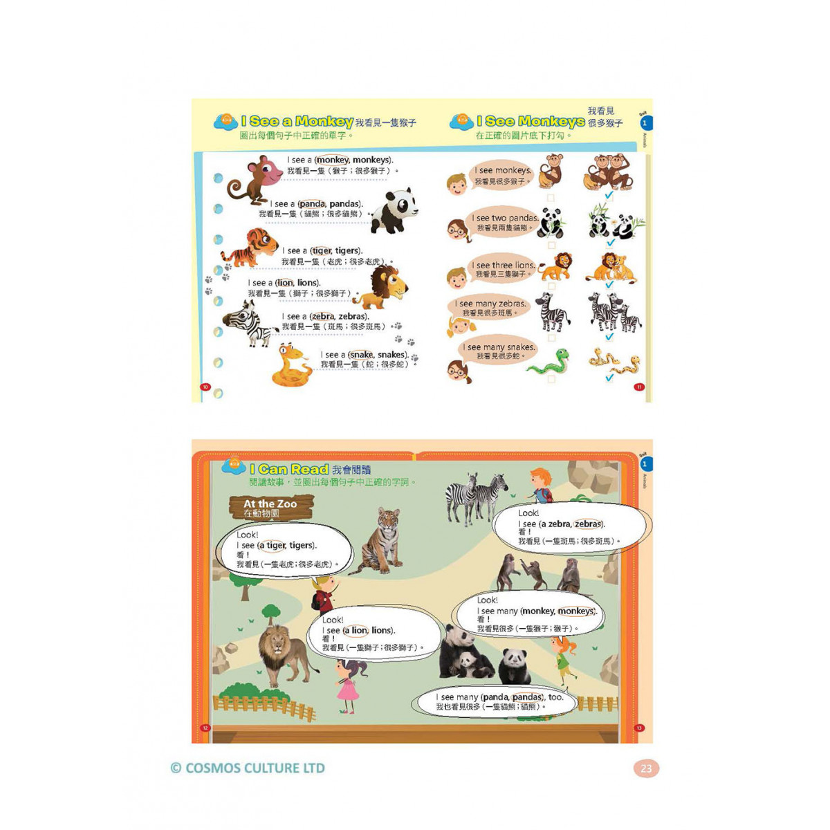本冊主題為名詞(Nouns),主要介紹生活中常見的八大類單複數名詞(an apple, apples . . .)與不可數名詞(ice cream . . .)等,以及認識不定冠詞(a, an)、複數(-s, -es)和指示代名詞單數(this, that)與複數(these)的情境運用,引導孩童使用正確的名詞來練習表達擁有、喜好之物,與事物單複數及遠近關係等不同情境的句子。