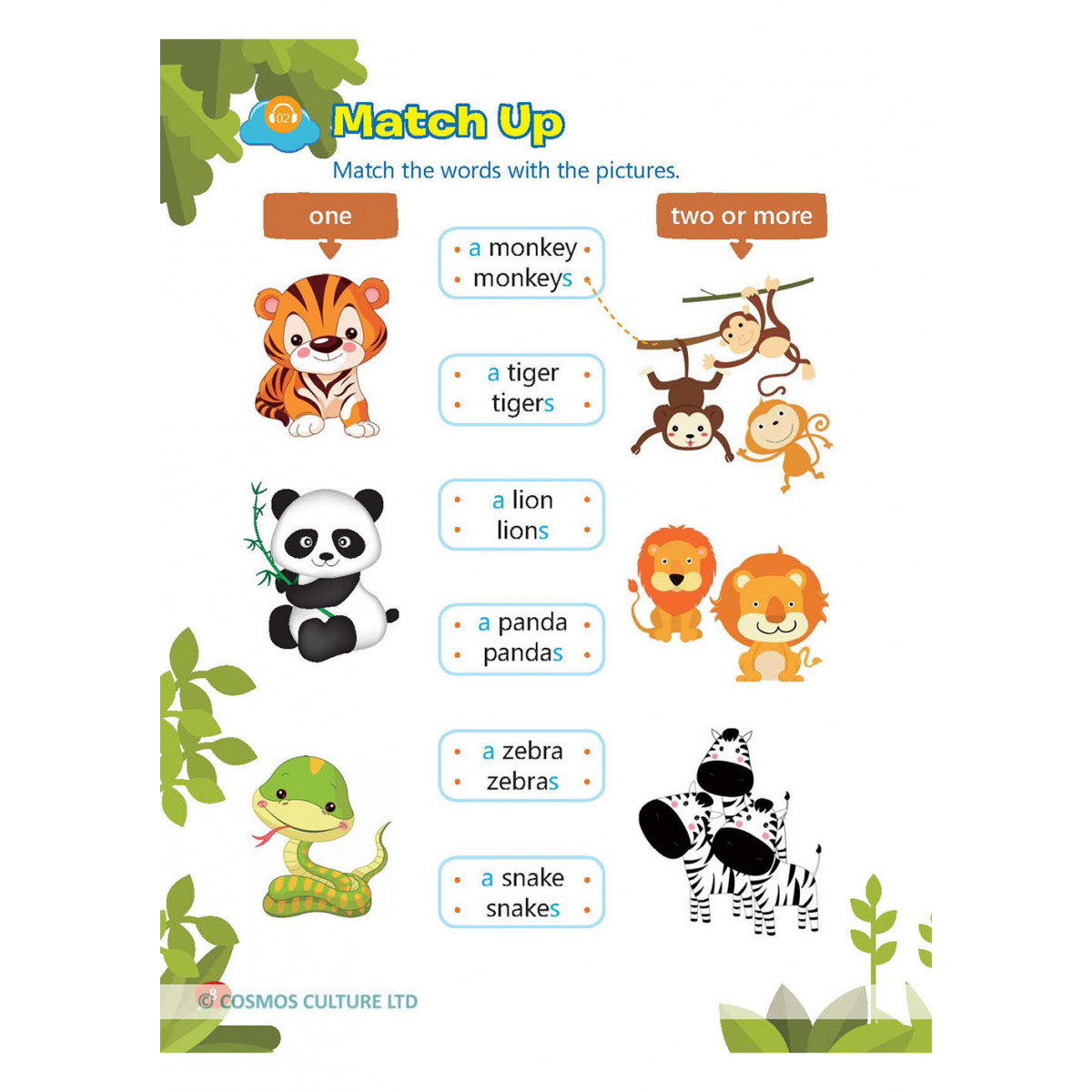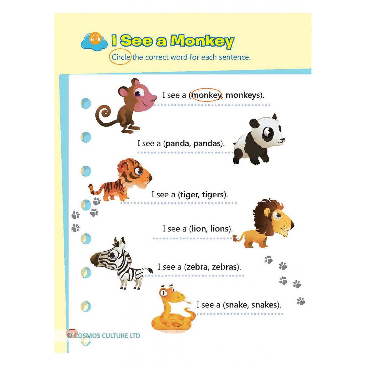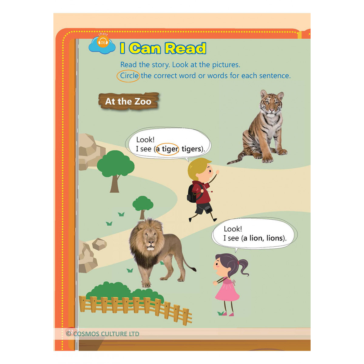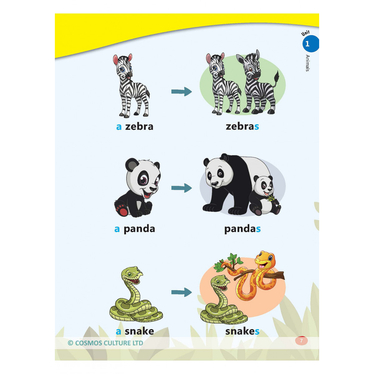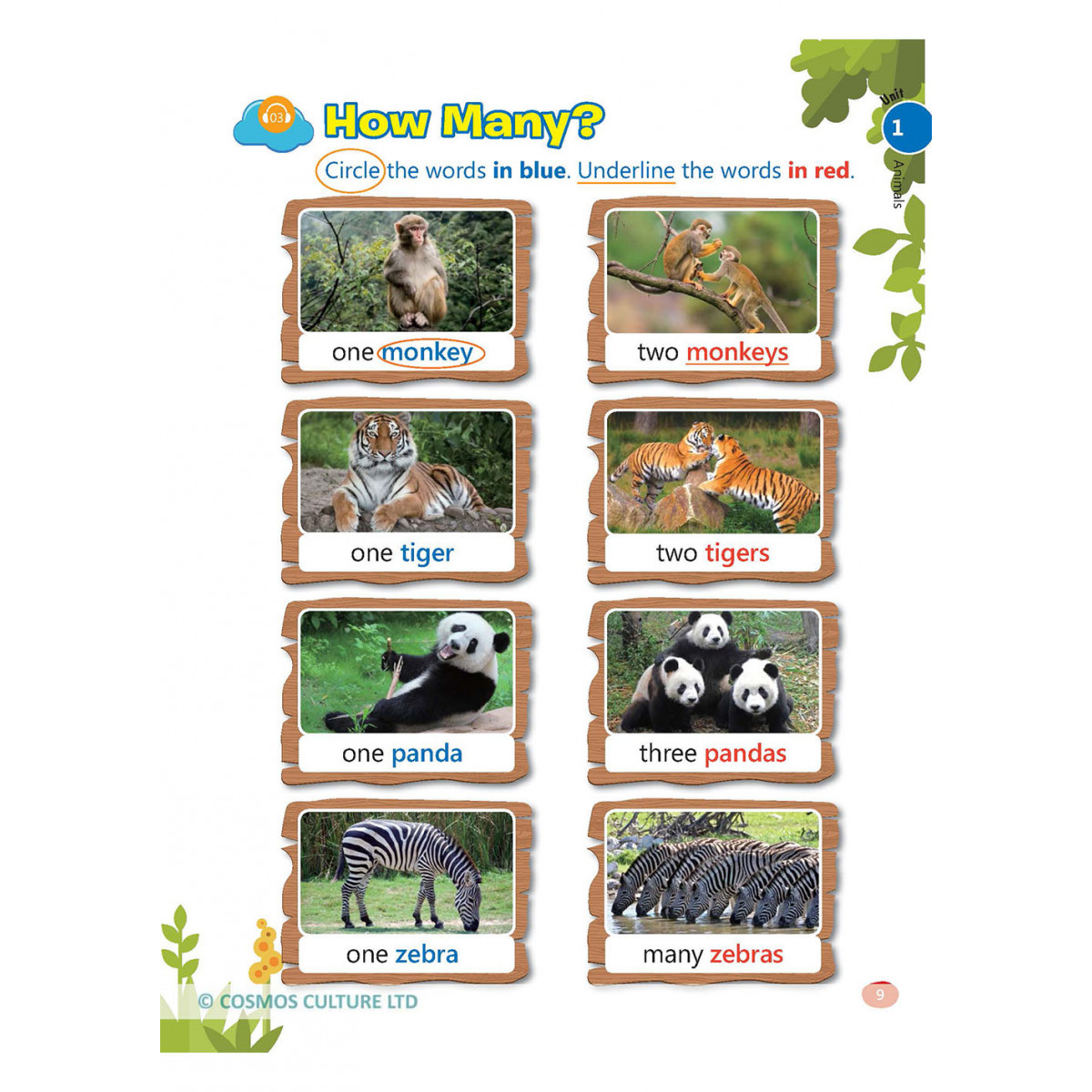 本冊主題為名詞(Nouns),主要介紹生活中常見的八大類單複數名詞(an apple, apples . . .)與不可數名詞(ice cream . . .)等,以及認識不定冠詞(a, an)、複數(-s, -es)和指示代名詞單數(this, that)與複數(these)的情境運用,引導孩童使用正確的名詞來練習表達擁有、喜好之物,與事物單複數及遠近關係等不同情境的句子。