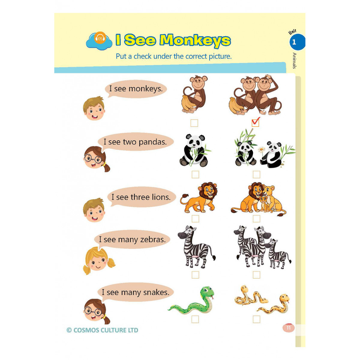 看圖片找答案,或讓孩子以圈選或是連連看的方式選出題目中要求的詞彙。在尋找的過程中,孩子會不斷重複閱讀到核心字彙,自然而然地建構基礎文法與閱讀技巧。