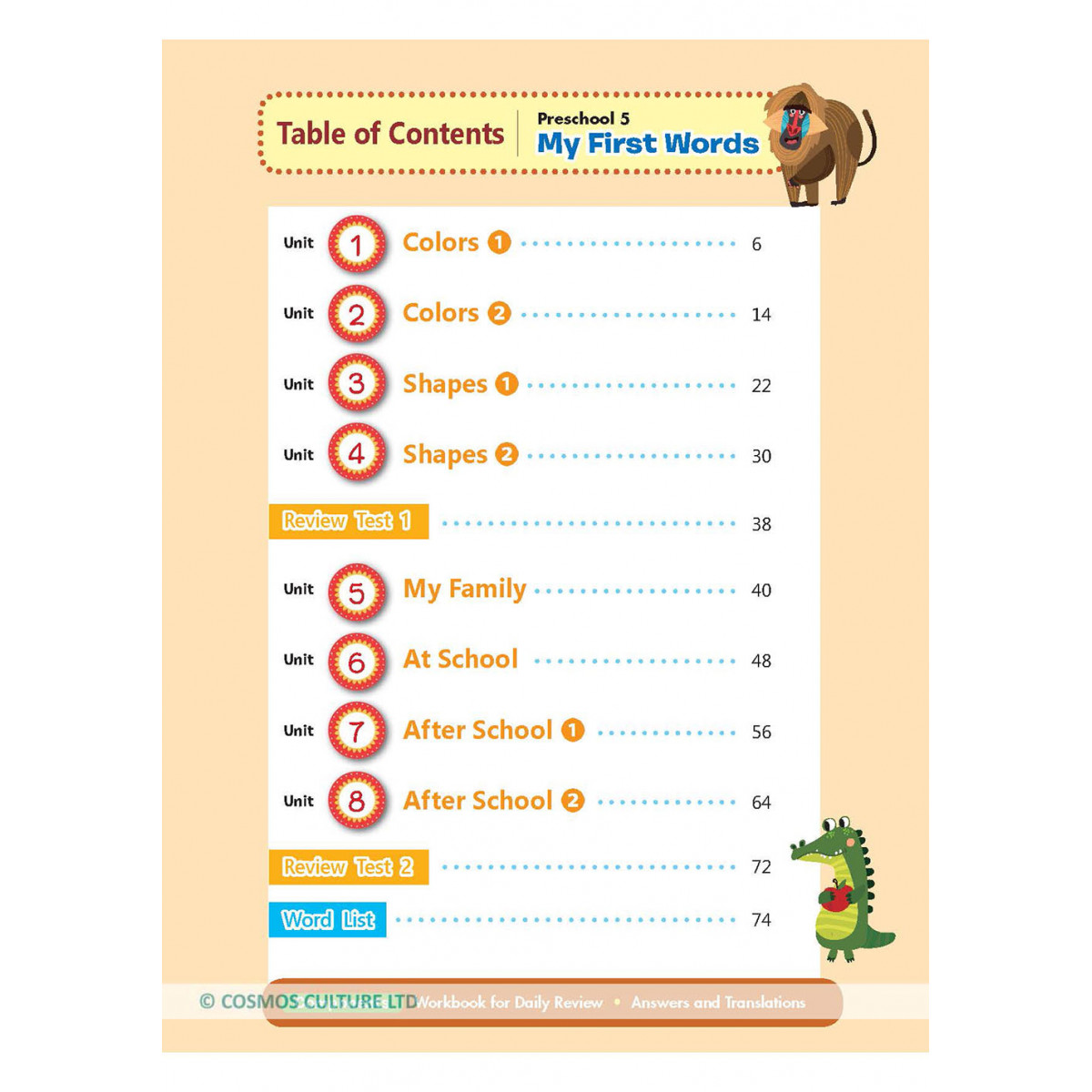 本冊主題為初學單字(My First Words),主要介紹日常生活中孩童會遇到的基礎單字,如顏色、形狀等初階字彙,及家人、學校等相關字詞,讓孩童由自己生活周遭環境隨處可見的事物來學習單字,並引導熟悉其意義與情境,讓孩童從自己熟悉的地方開始學習英語單字與基礎句型。
