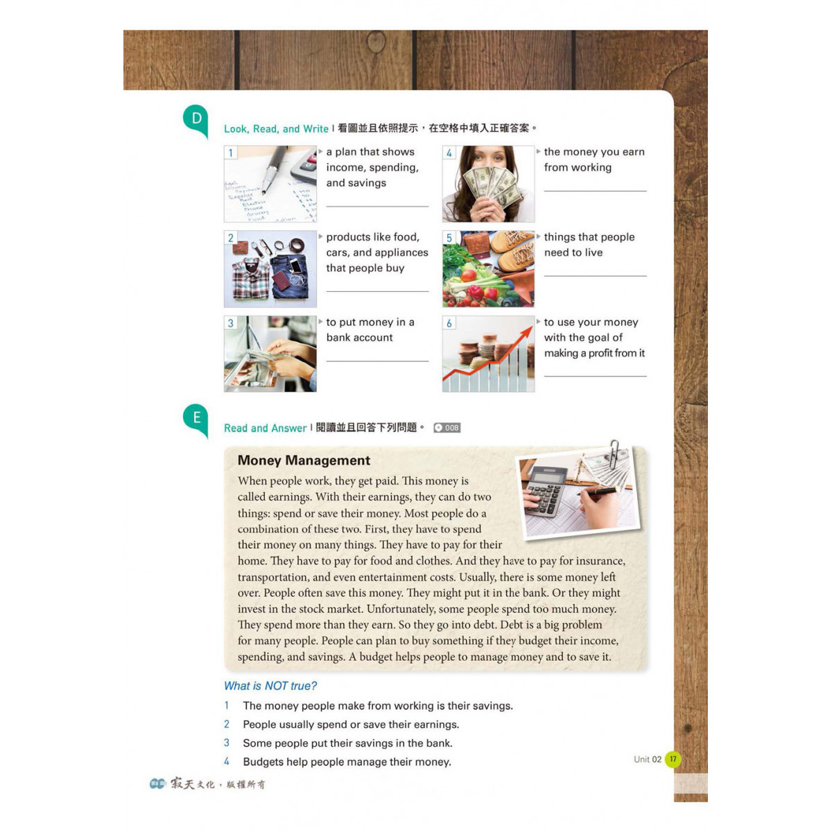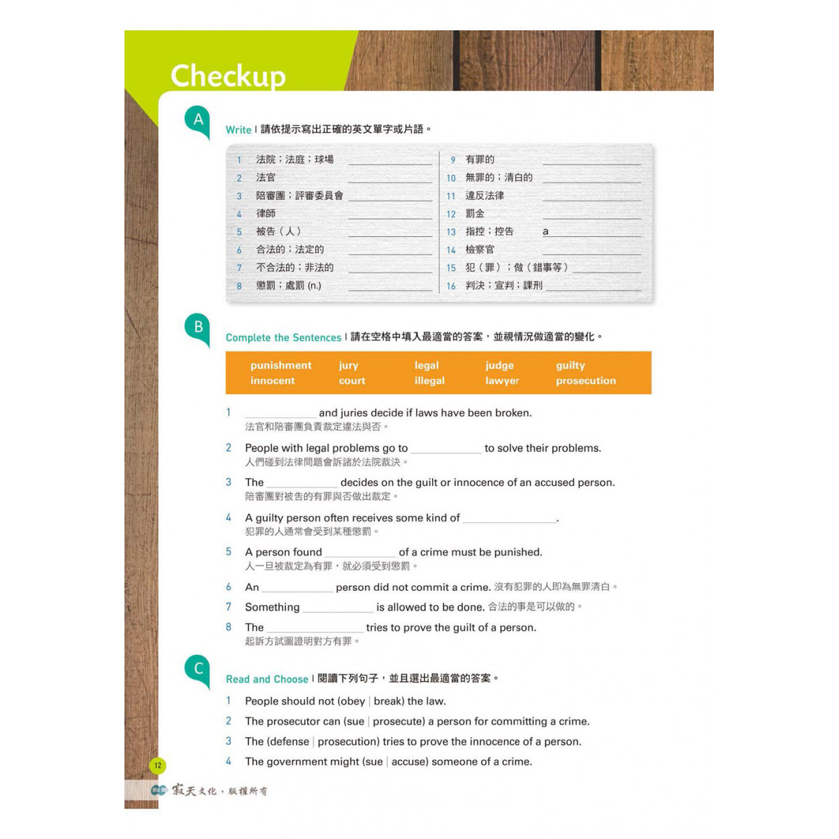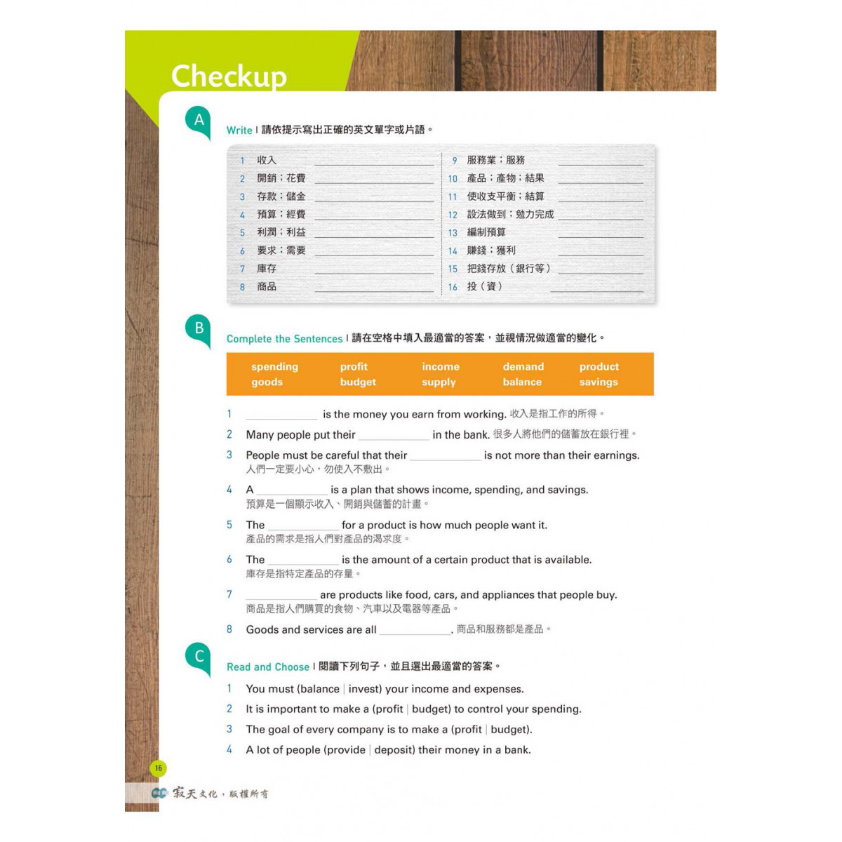 題型包括字彙中翻英、單字選填、看圖填單字,以及閱讀理解,測驗讀者對各科字彙的理解程度,除了加深對單字的印象,並能強化聽、讀、寫的能力。