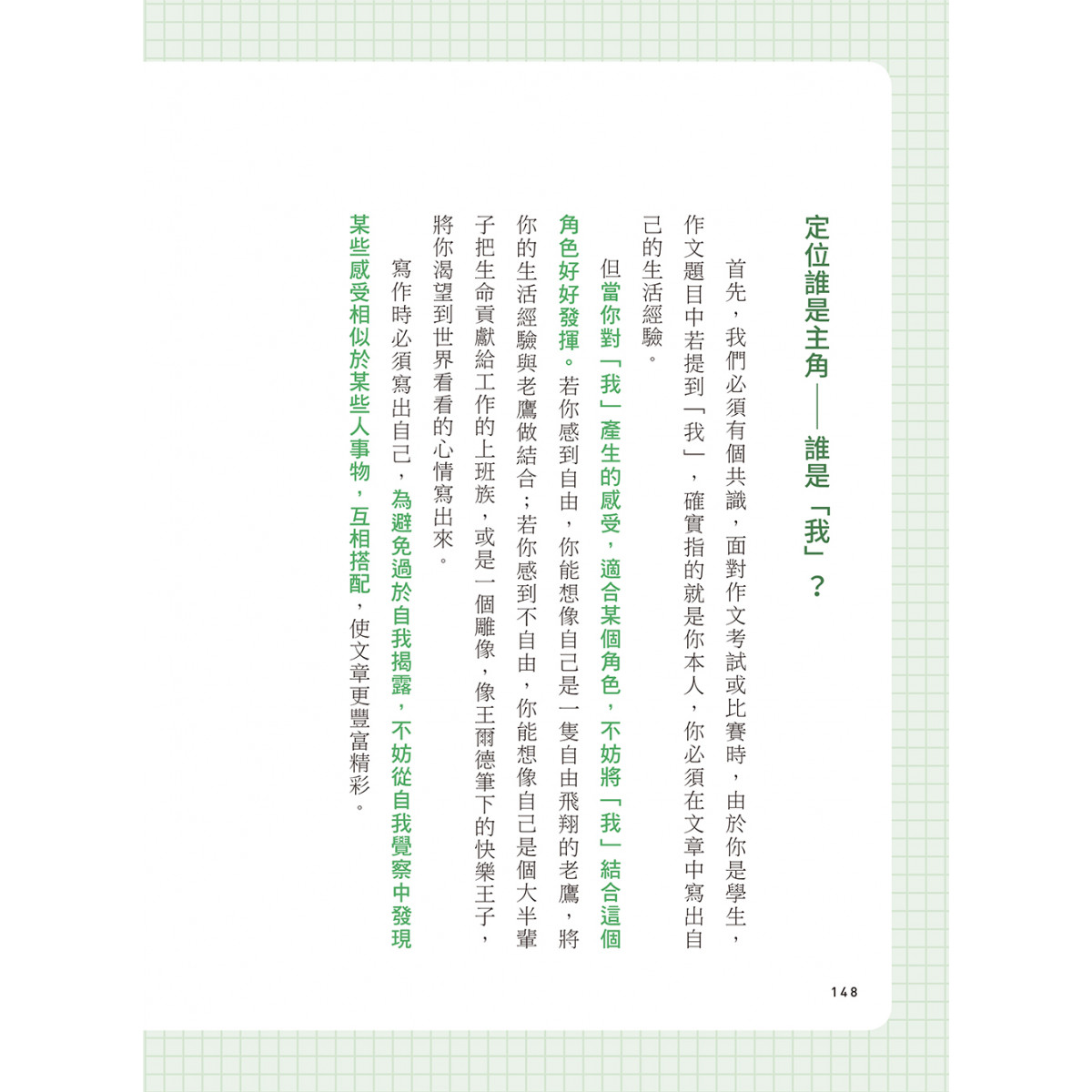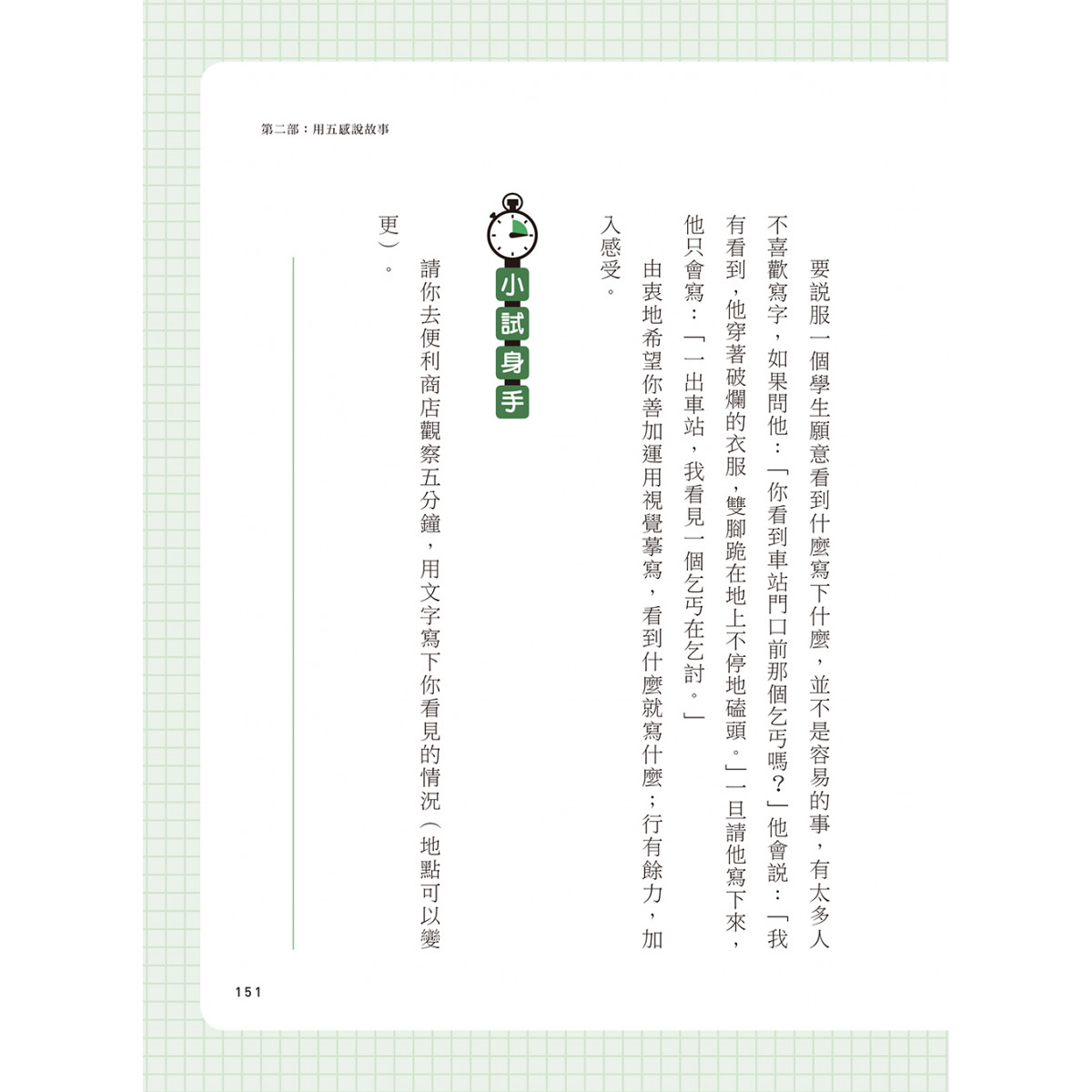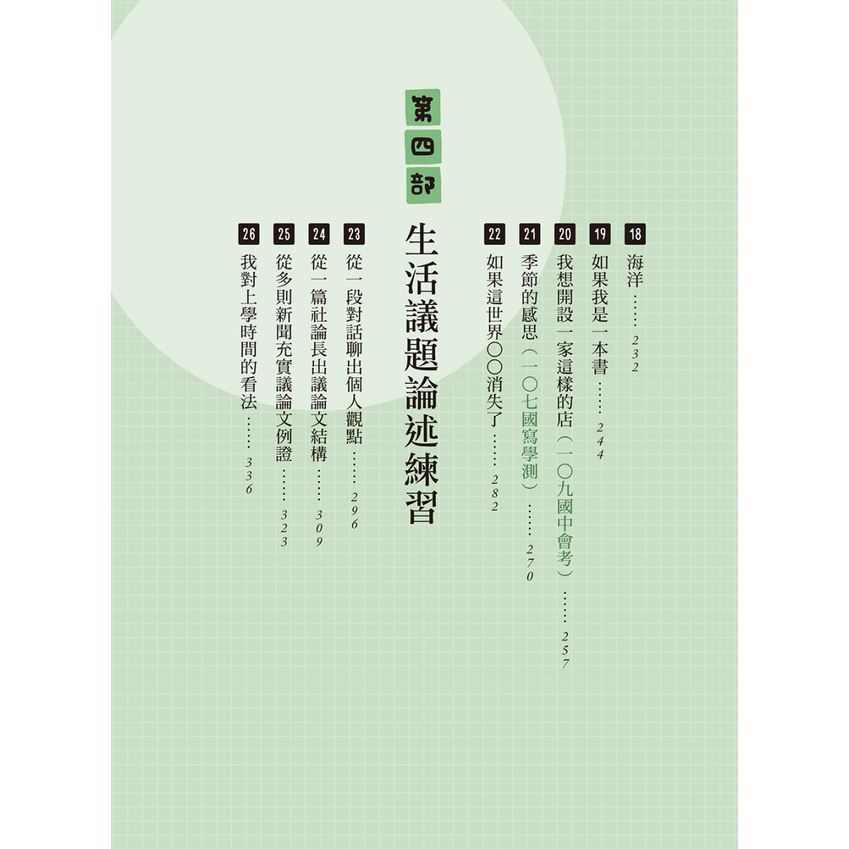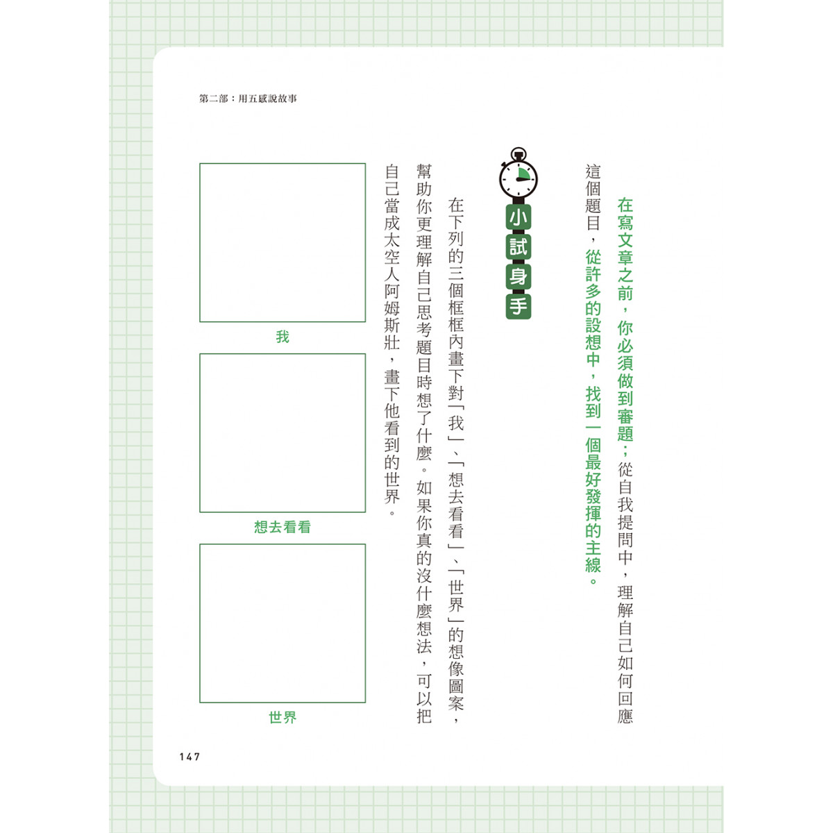 全書共26單元,每單元皆包含2~3則讓寫作融入生活的「小試身手」,以及2~3關提升寫作實力的「寫作任務」,協助讀者激發腦中想法,寫出觀點獨到的文章。