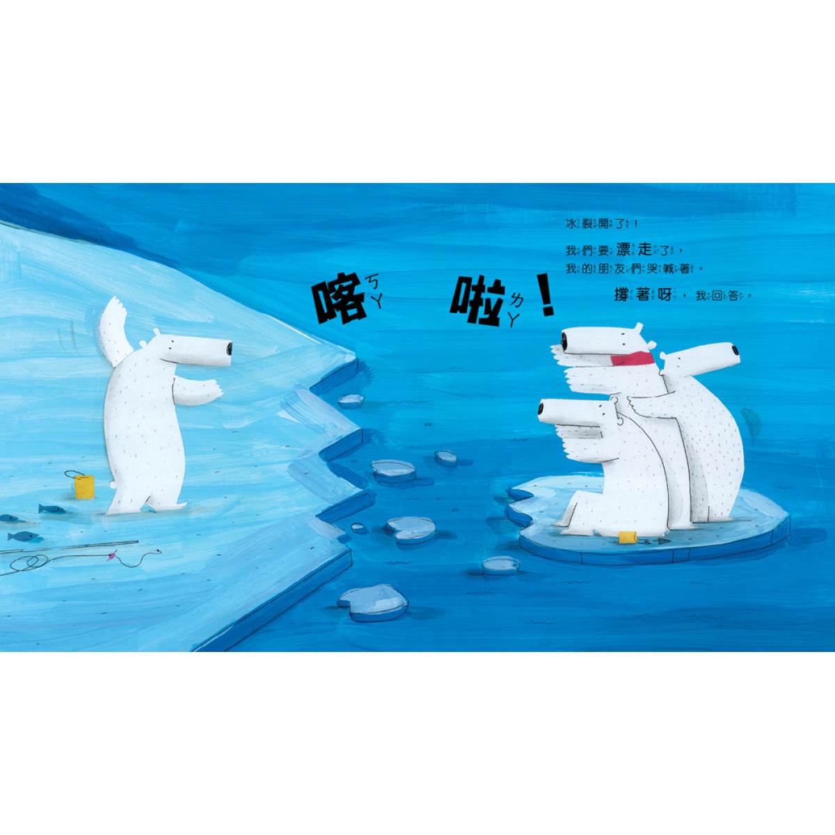 當親子共讀時,可以將溫馨趣味的故事與現況連結,和孩子討論地球暖化,冰山逐漸溶解所造成的北極熊失去家園,以及生存的危機。──葉嘉青 臺灣師範大學講師暨臺灣閱讀協會常務理事