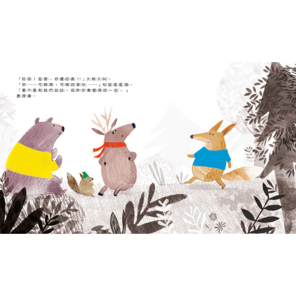 故事中提到:「我喜歡紅蘋果,但這並不意味著我生氣!而我的最愛顏色是藍色,但這並不意味著我難過。有時候即使在我過得不好的日子,我也會穿黃色的衣服。」簡潔有力的話語,不跟其他三隻思維「單細胞」的動物進行辯論,足見狐狸的大智慧。