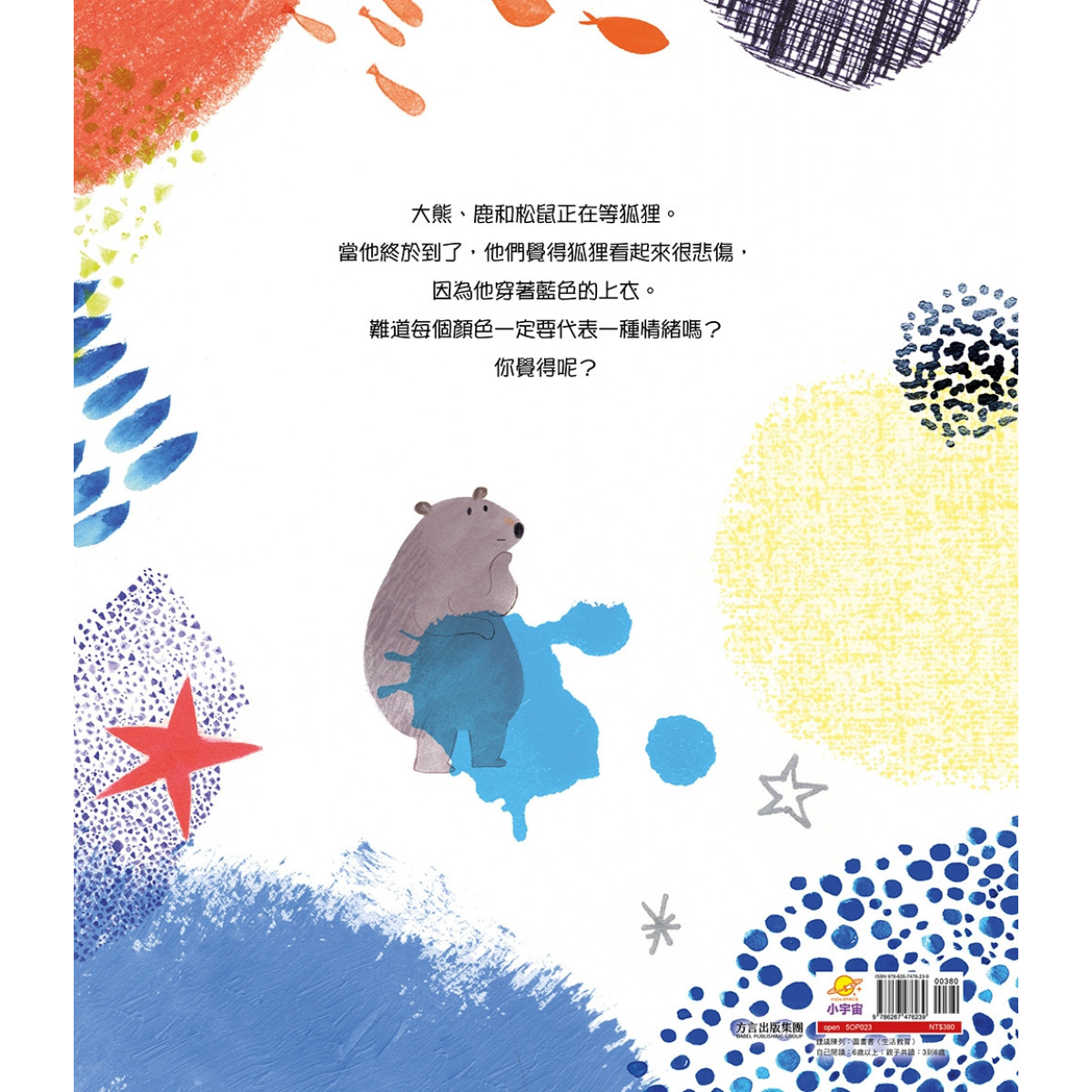 大熊、鹿和松鼠正在森林裡享受美好的下午時光,看見狐狸身穿藍色的衣服,就開始戴著主觀的有色眼鏡,以主觀的態度和想法,討論起顏色所代表的情緒。最後,聰明的狐狸給了結論:「當然!顏色是自由的!」