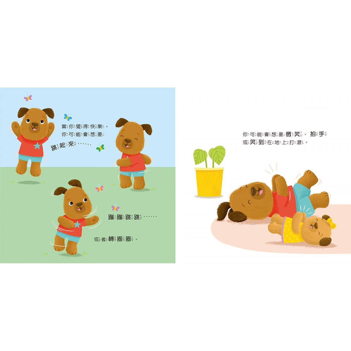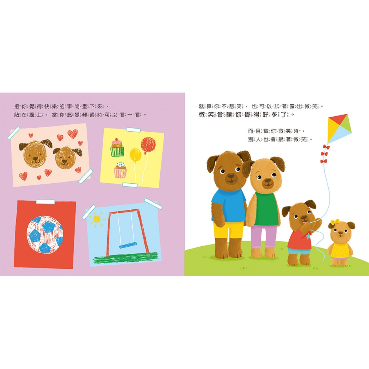 在小狗的陪伴下,孩子們學會識別並表達自己的快樂情緒,並透過清晰的文字與貼近孩子心靈的語彙,鼓勵他們勇敢地分享喜悅,並與他人分享自己的快樂。