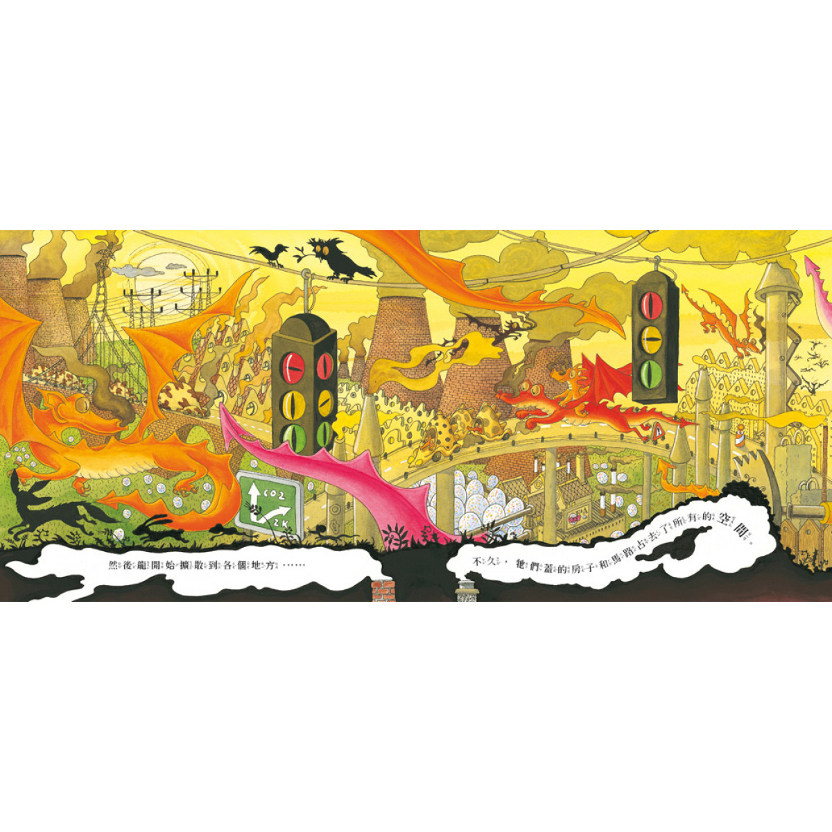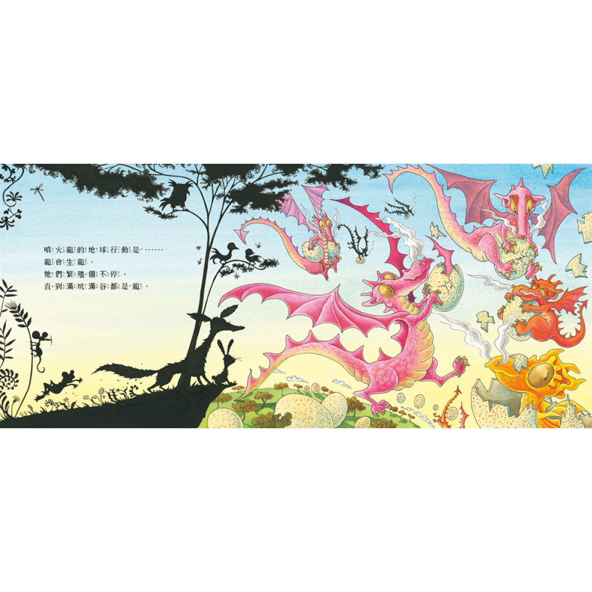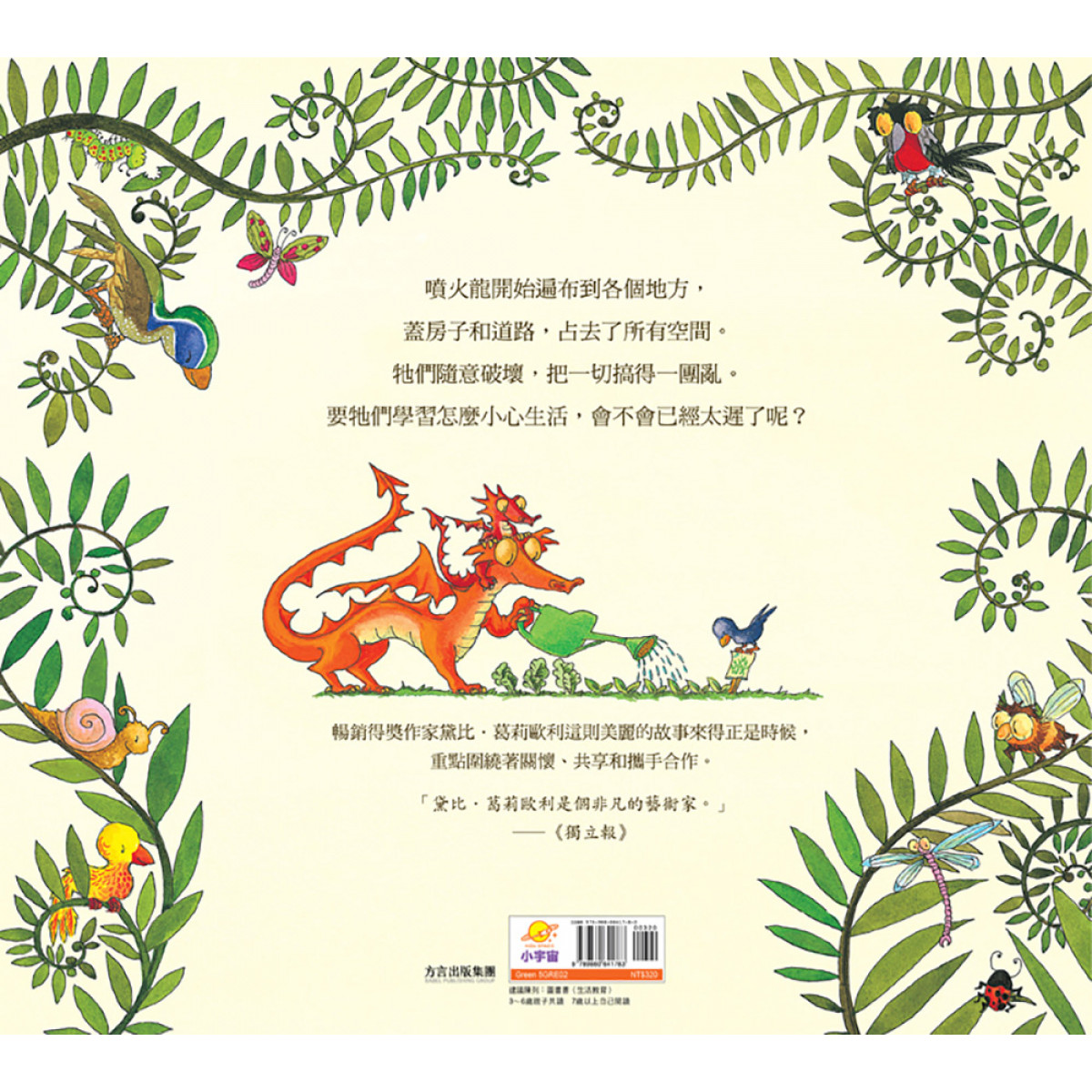 龍停止噴火,並開始尊重所有在地球上的生物,懂得回收再利用,降低自己的需求。本書以童趣文筆和奇幻畫風,傳達重要的環境議題,即使年幼孩子也很容易親近理解,是一則深具啟發性的現代寓言。