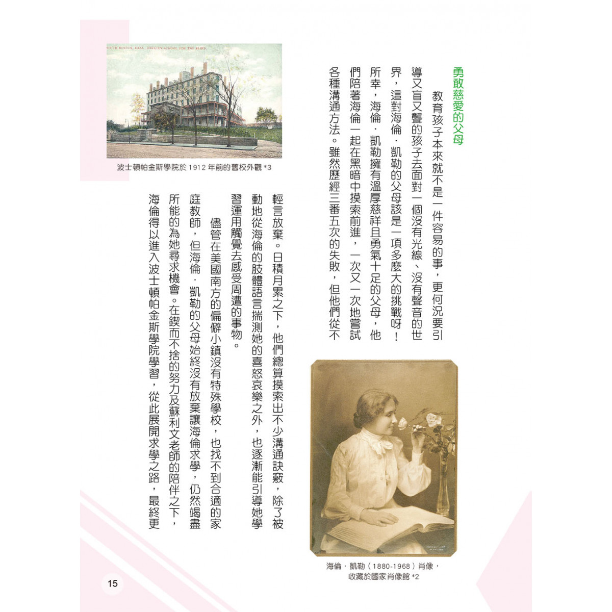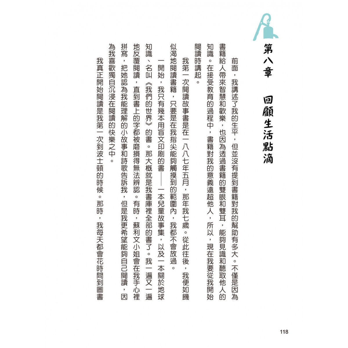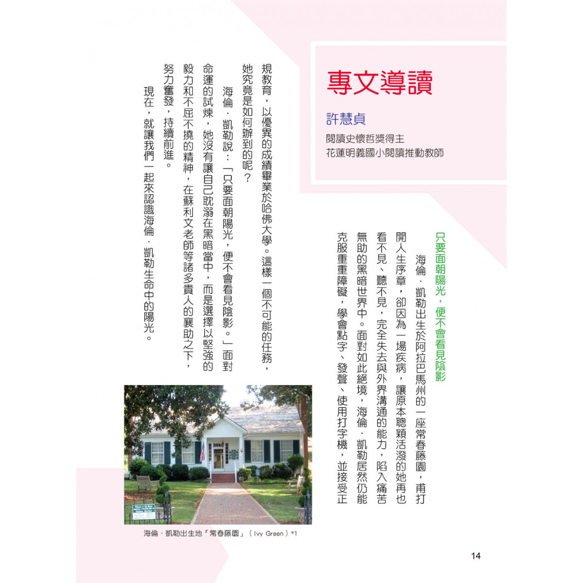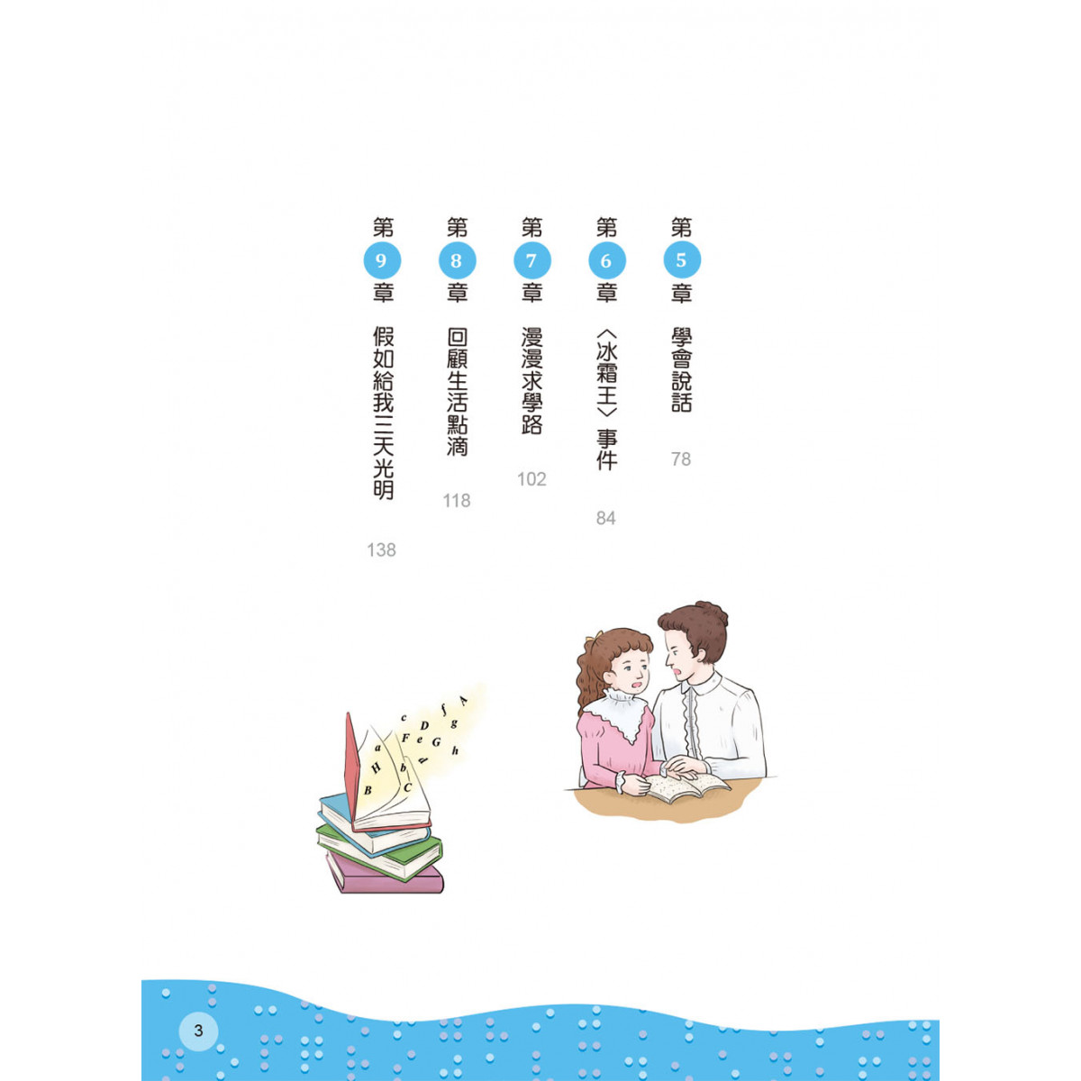 書中另收錄《假如給我三天光明》,描繪海倫假想自己獲得視力後嚮往看到的世界,充滿了樂觀惜福的正向能量。