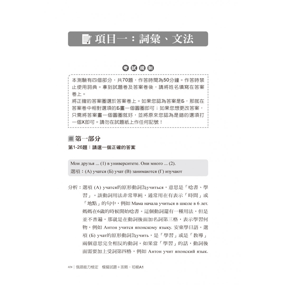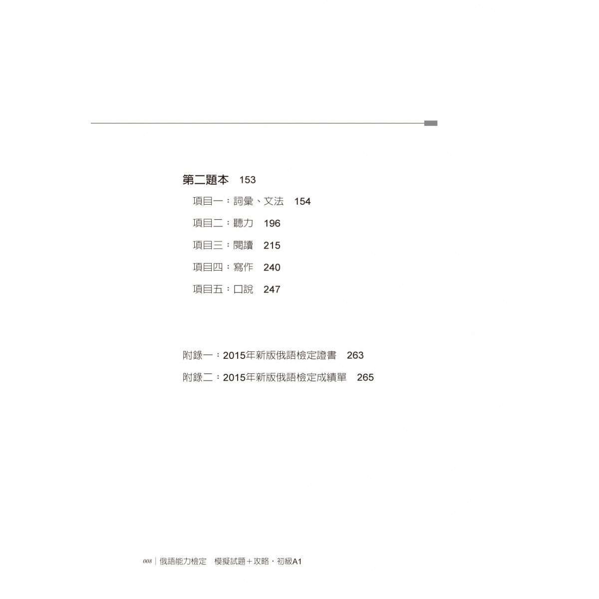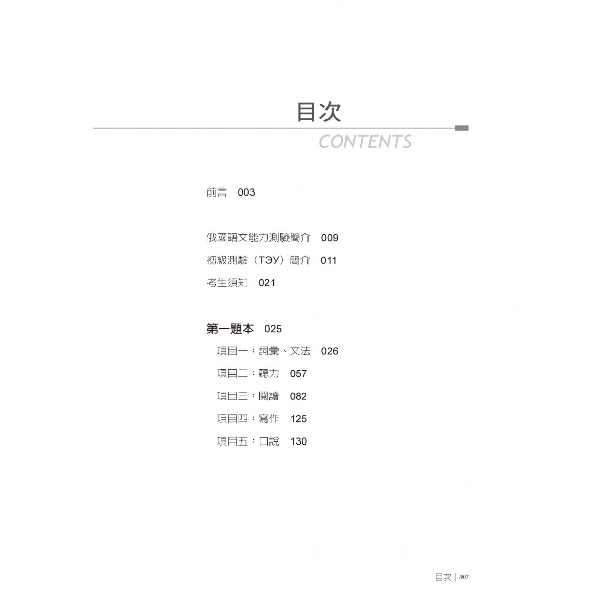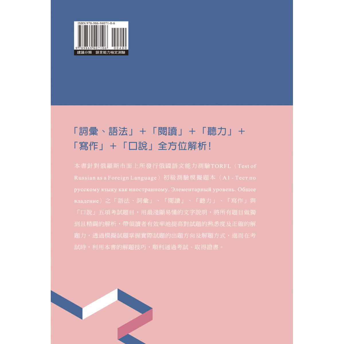 本書針對俄羅斯市面上所發行俄國語文能力測驗TORFL(Test of Russian as a Foreign Language)初級測驗模擬題本(A1 - Тест по русскому языку как иностранному. Элементарный уровень. Общее владение)之「語法、詞彙」、「閱讀」、「聽力」、「寫作」與「口說」五項考試題目,用最淺顯易懂的文字說明,將所有題目做獨到且精闢的解析,帶領讀者有效率地提高對試題的熟悉度及正確的解題力,透過模擬試題掌握實際試題的出題方向及解題方式,進而在考試時,利用本書的解題技巧,順利通過考試、取得證書。