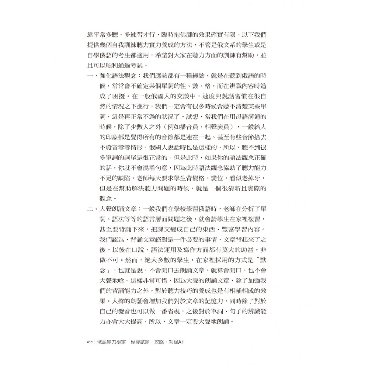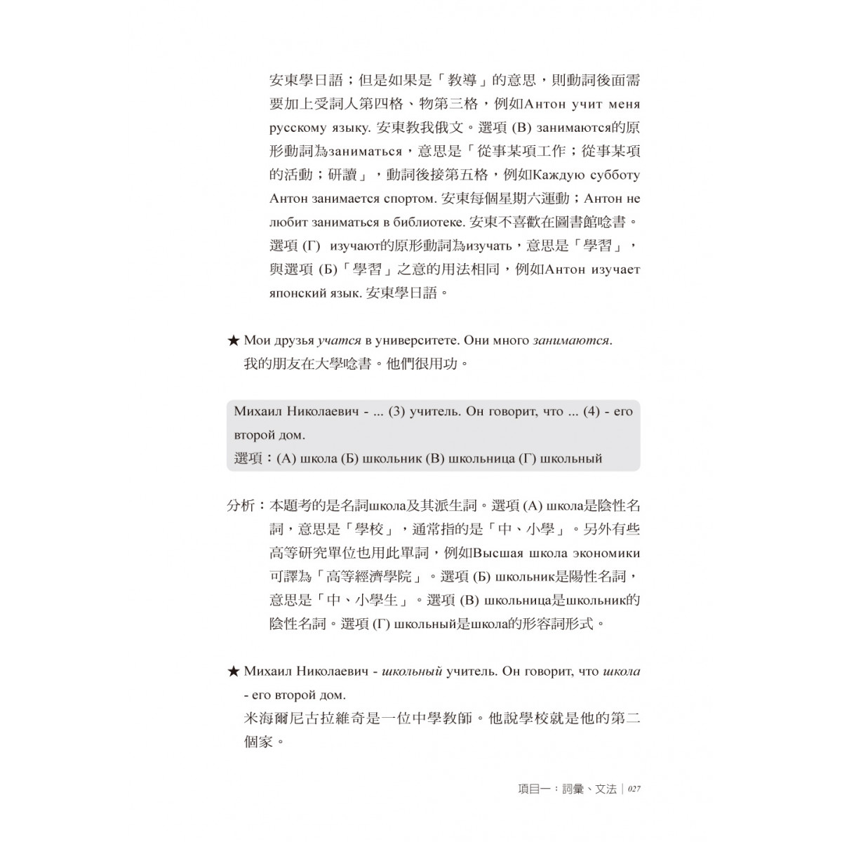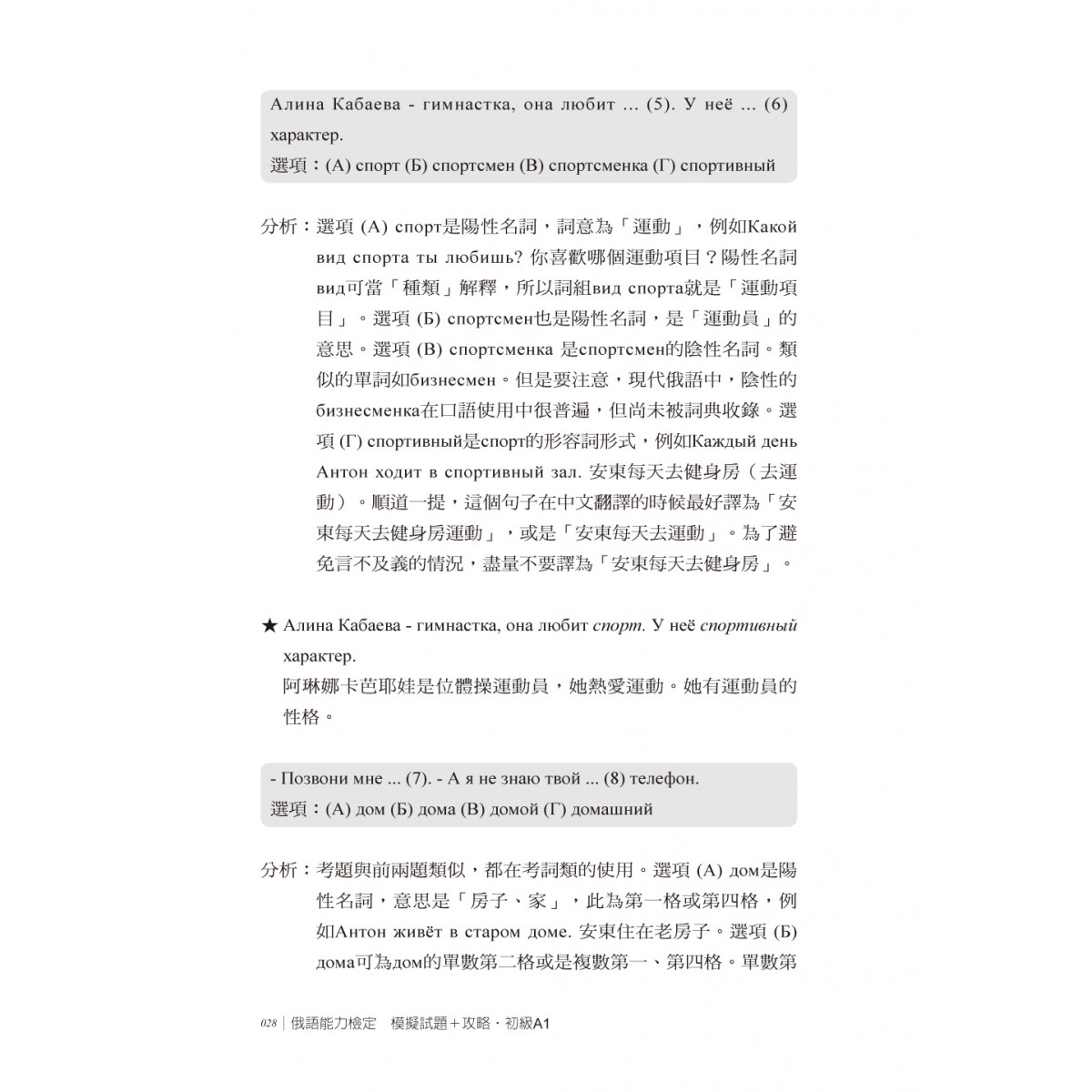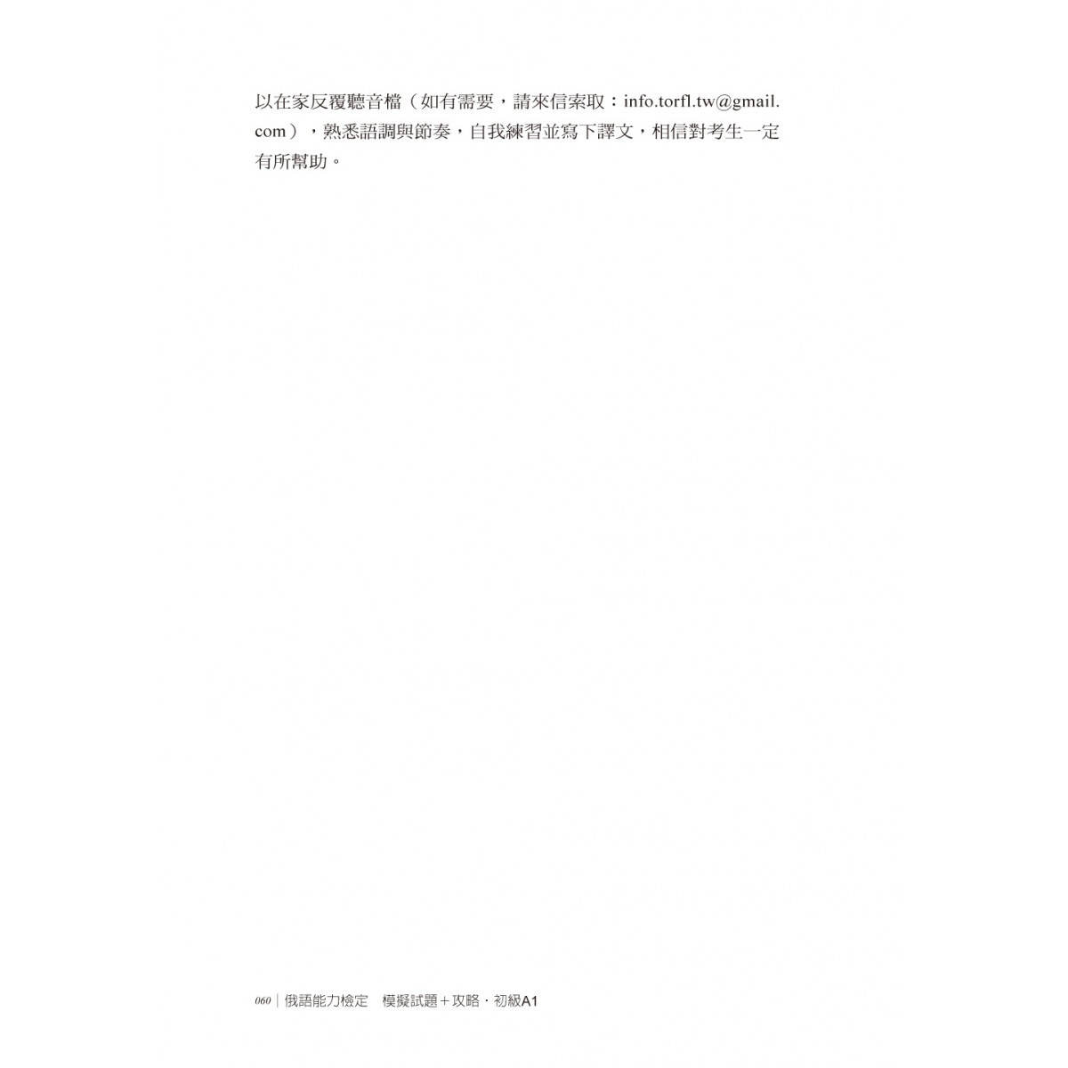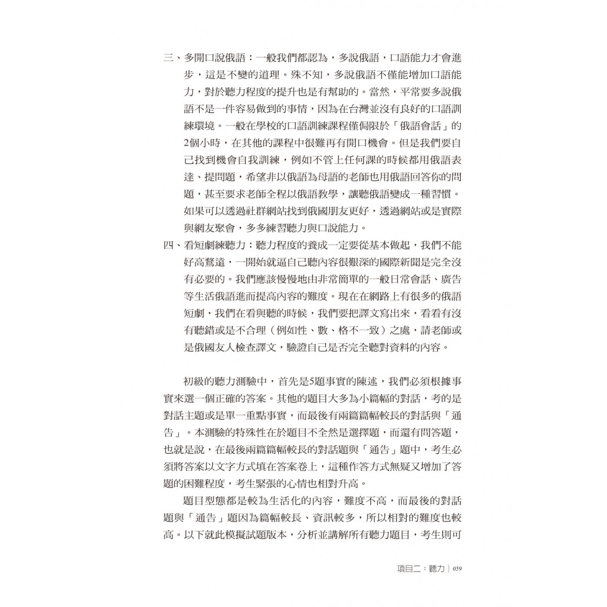 本書針對俄羅斯市面上所發行俄國語文能力測驗TORFL(Test of Russian as a Foreign Language)初級測驗模擬題本(A1 - Тест по русскому языку как иностранному. Элементарный уровень. Общее владение)之「語法、詞彙」、「閱讀」、「聽力」、「寫作」與「口說」五項考試題目,用最淺顯易懂的文字說明,將所有題目做獨到且精闢的解析,帶領讀者有效率地提高對試題的熟悉度及正確的解題力,透過模擬試題掌握實際試題的出題方向及解題方式,進而在考試時,利用本書的解題技巧,順利通過考試、取得證書。