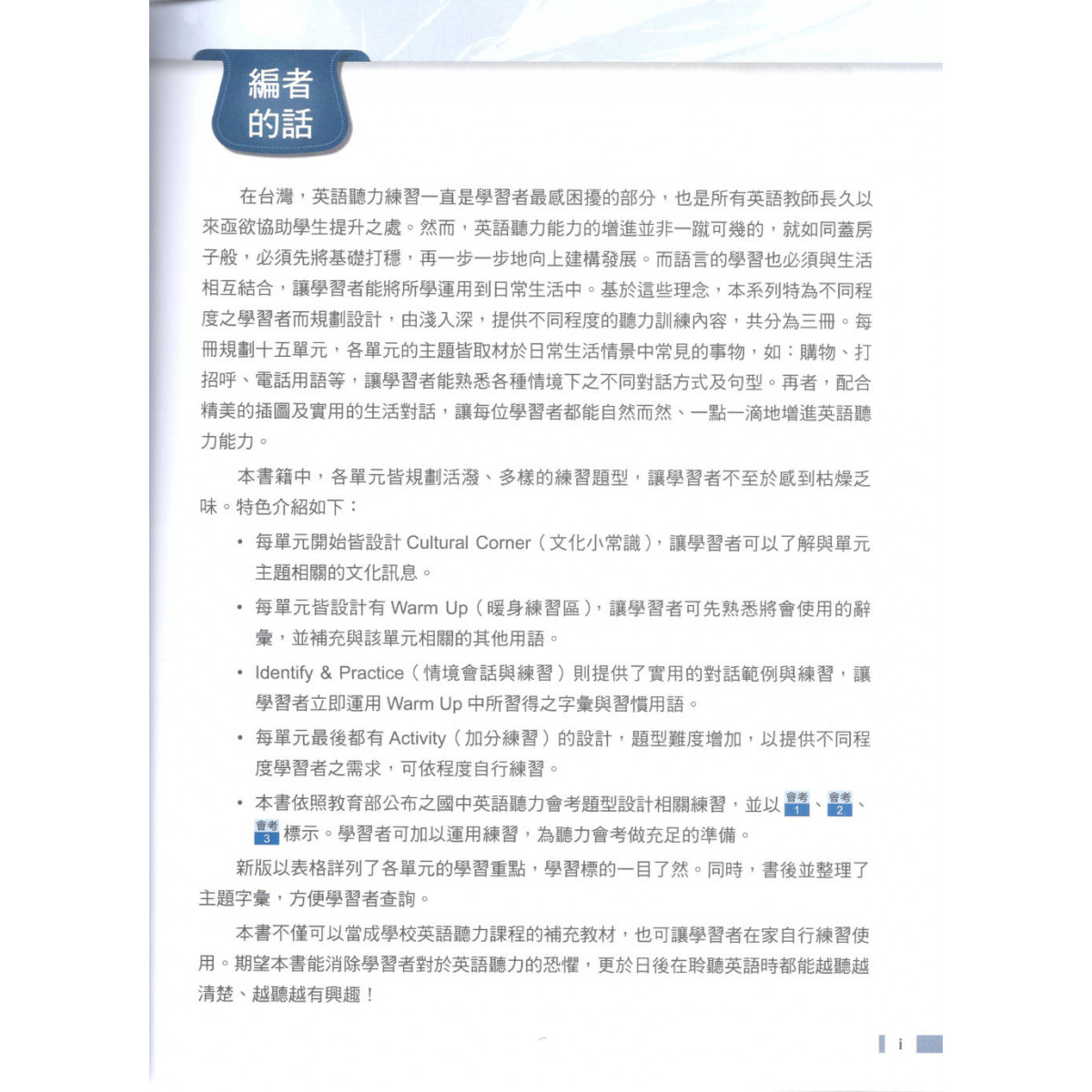 5.本書依照教育部公佈之國中英語聽力會考題型設計相關練習,並以會考圖示題點標示。學習者可加以運用學習,為聽力會考做充足的準備。