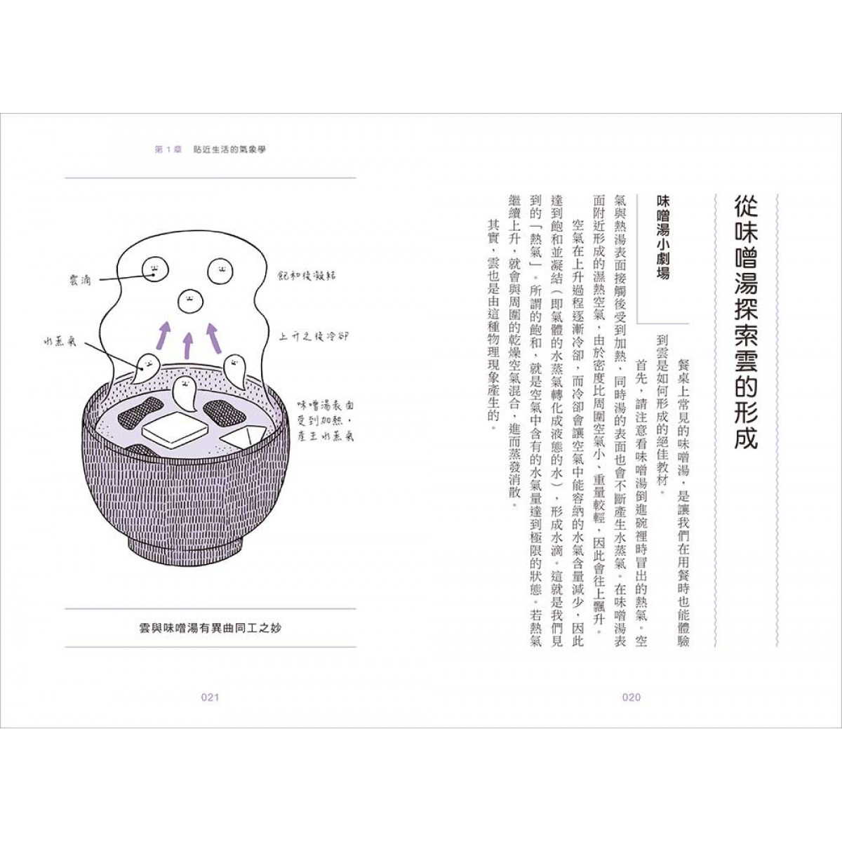 從一碗味噌湯探索雲的形成、從熱咖啡漩渦認識氣旋、從冰棒了解冰的結晶、從浴室鏡子認識結露現象……其實氣象就在我們的身邊,利用這些日常情境說明各種變化,氣象學會變得更親近。