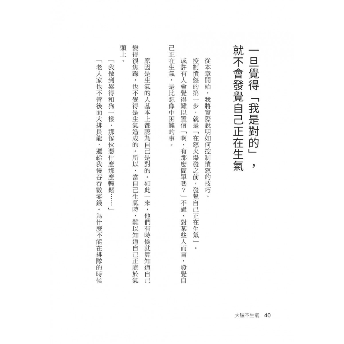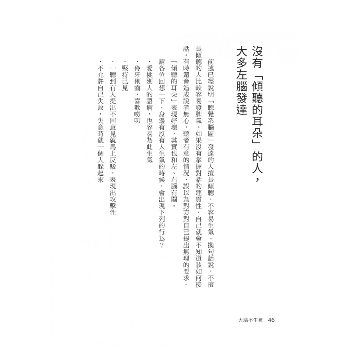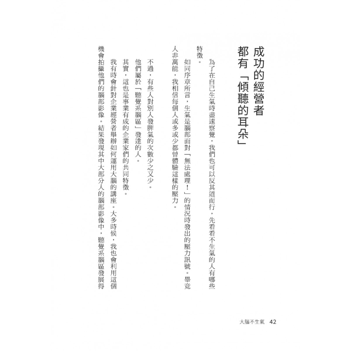 2.透過對專業人士的腦部掃描,得知不生氣的秘訣,與生氣的「方法」:專業人士大多「聽覺系腦區」發達,善於聆聽與理解他人語句,然而在必要時也能透過冷靜地斥責來引導事情往正確的方向前進。本書將會透過腦科學與實際觀察,告訴你如何透過腦科學進行情緒管理,使事情能更順利進行。