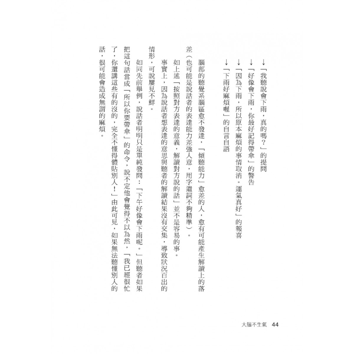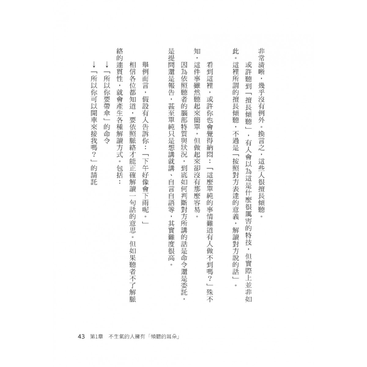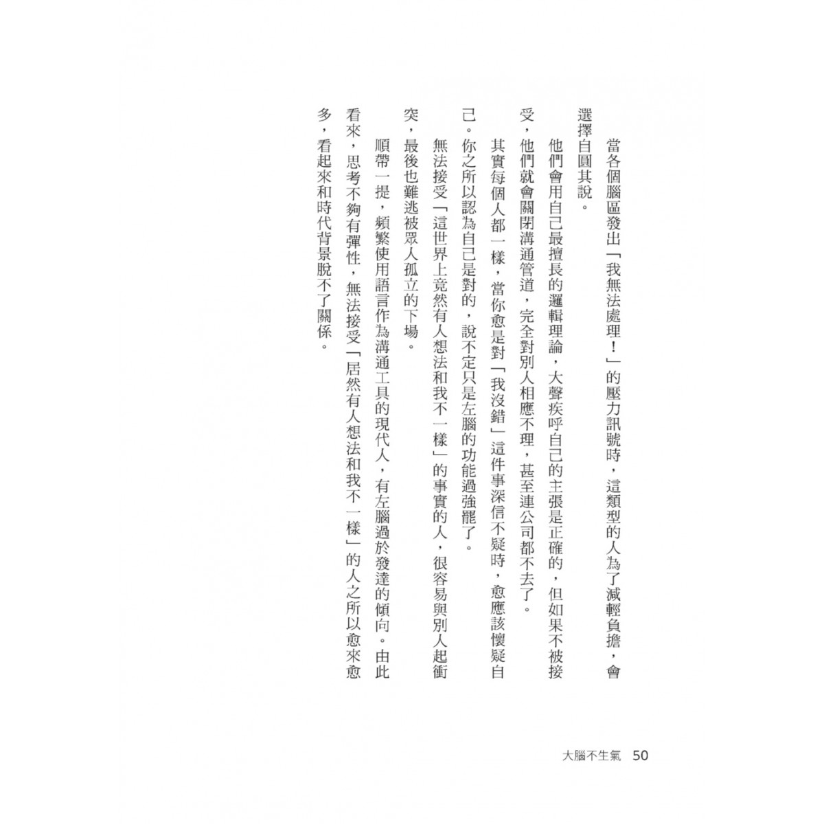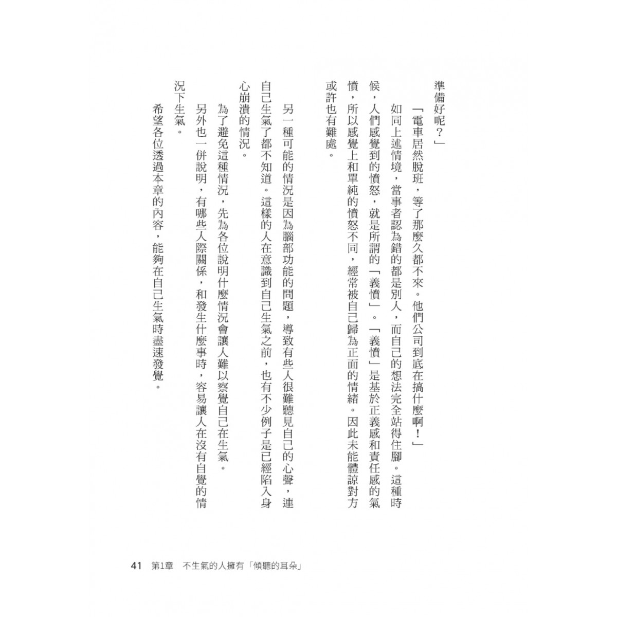 2.透過對專業人士的腦部掃描,得知不生氣的秘訣,與生氣的「方法」:專業人士大多「聽覺系腦區」發達,善於聆聽與理解他人語句,然而在必要時也能透過冷靜地斥責來引導事情往正確的方向前進。本書將會透過腦科學與實際觀察,告訴你如何透過腦科學進行情緒管理,使事情能更順利進行。