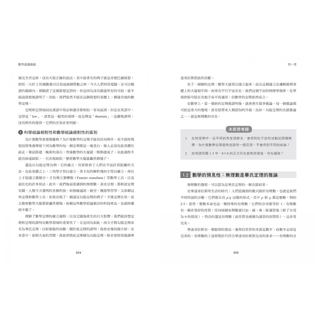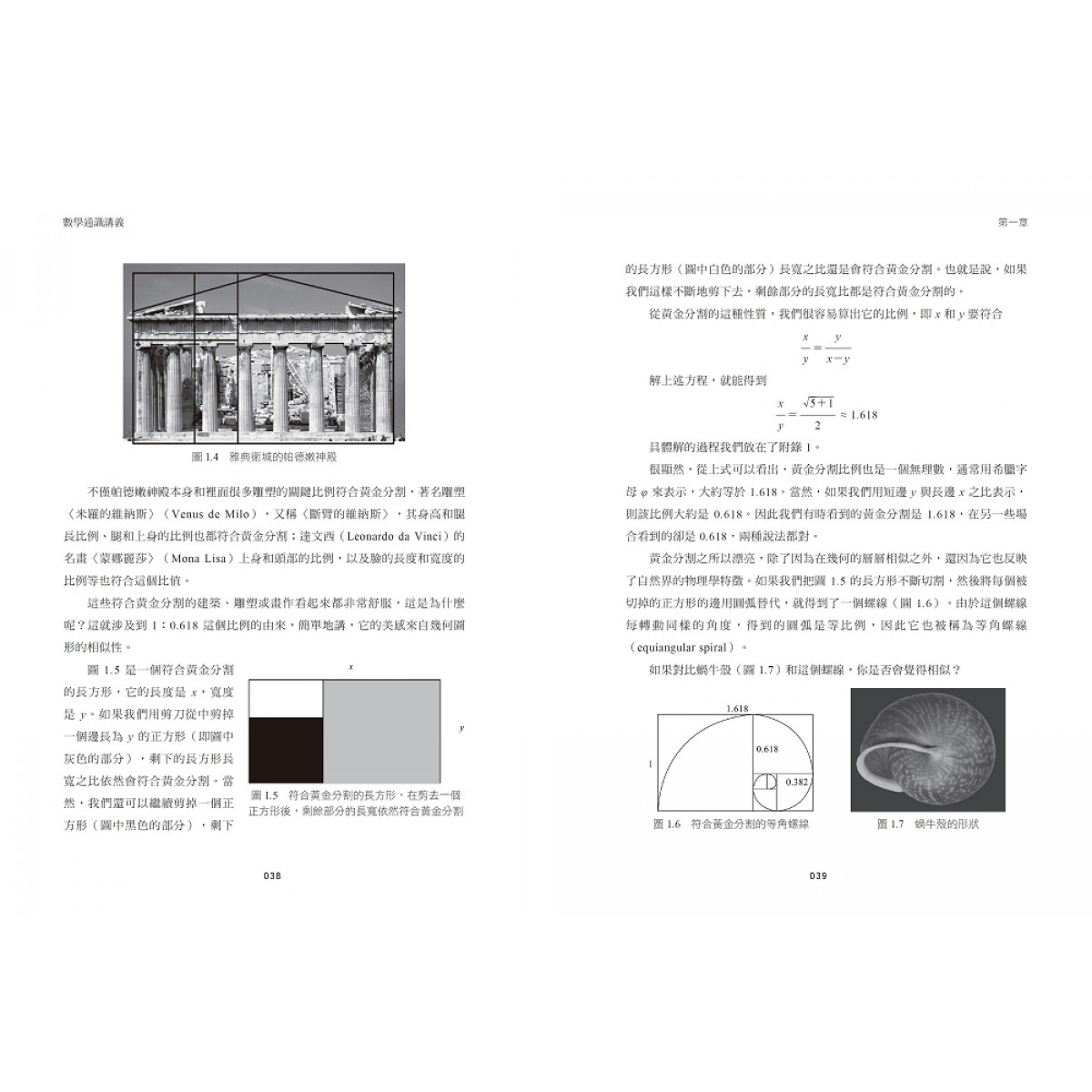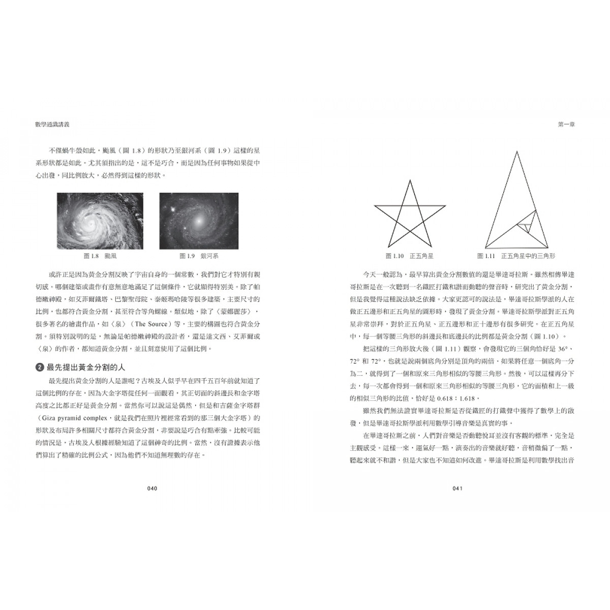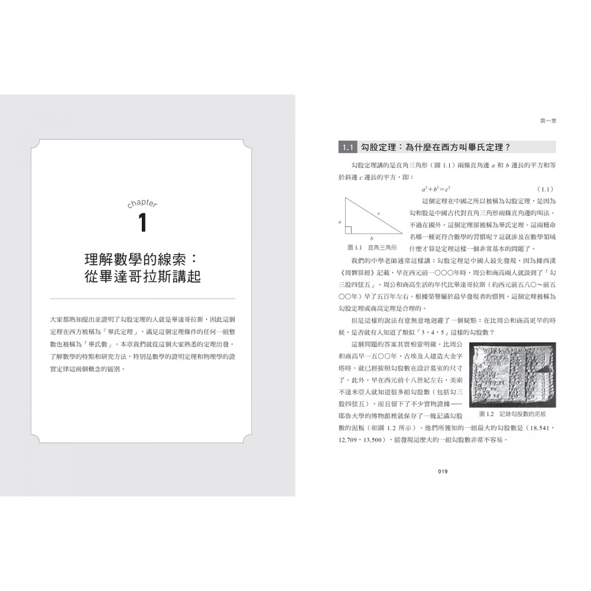 ◆基礎——數學最基本的原則就是邏輯上的「一致」和「完備性」,把看似獨立的知識串聯起來。從「勾股定理」的故事說起,揭露數學與美學、建築以及音樂的發展息息相關。
