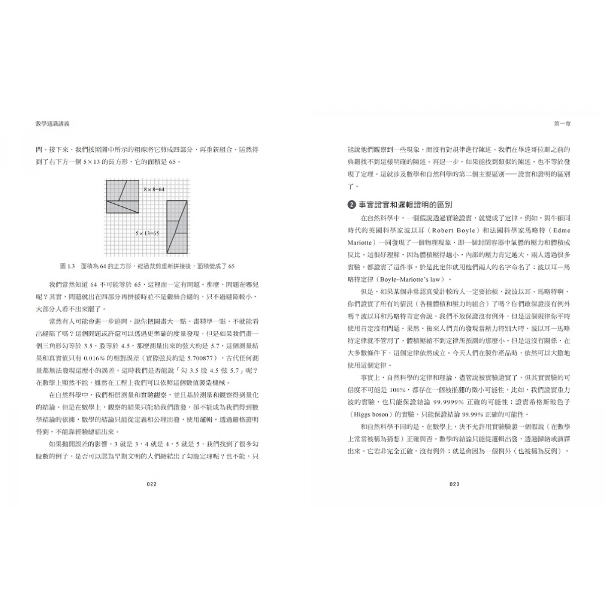 這是一本給所有人的數學通識講義,說的是運用數學的思考方式,而不是解答技巧,此外還能看到數學的有趣面:畢達哥拉斯為了否認「無理數」而害死自己的學生?美國南北戰爭時期,當時總統林肯竟然用「直角」的公理說服國會通過《解放奴隸宣言》?十六世紀數學家們為何要「決鬥」?他們對決的方式是什麼?