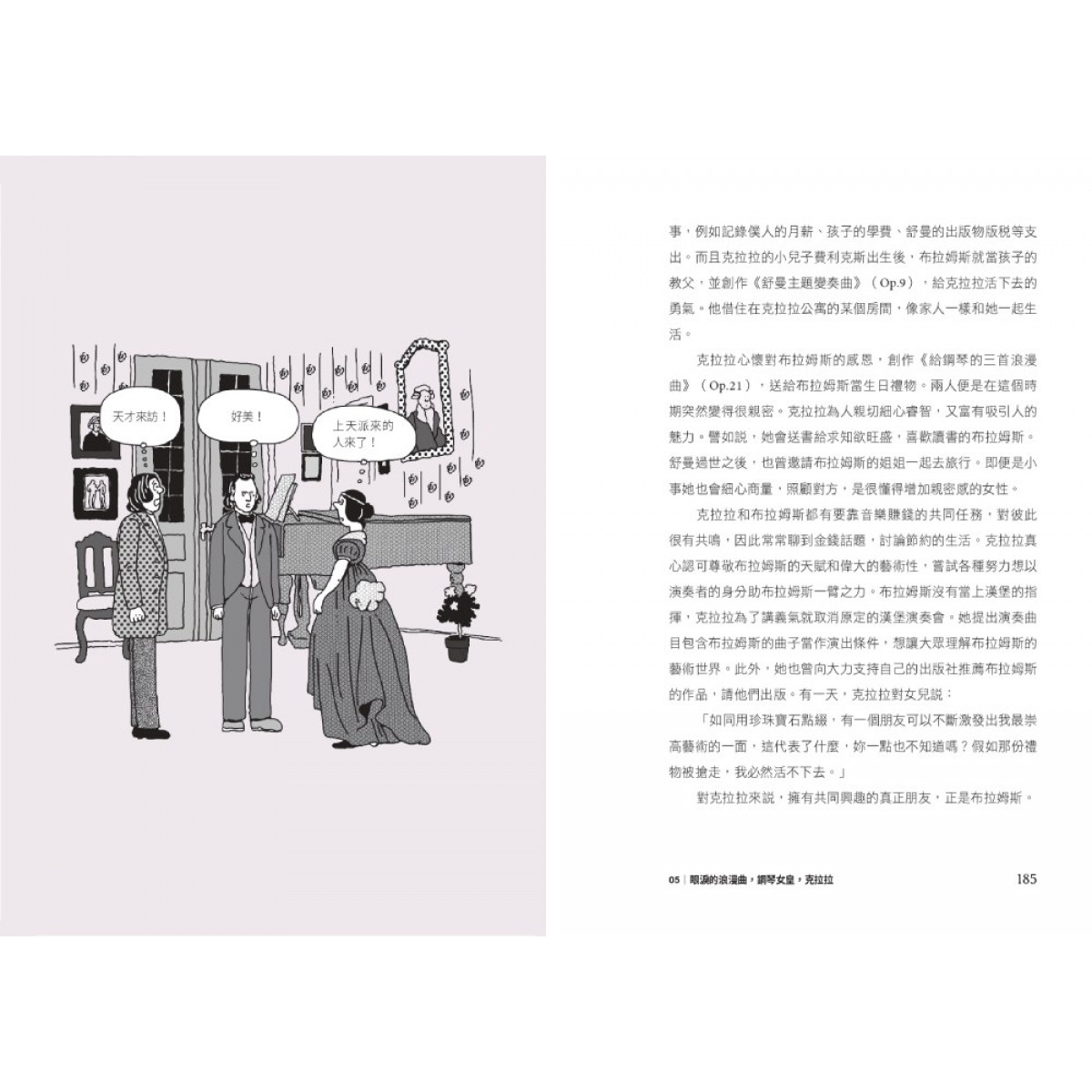 我讀過許多古典音樂的入門書籍,但從未見過像這本一樣深入探討作曲家「情感」的書。讀者可以在閱讀一位偉大作曲家生平的同時聆賞他的作品,幾年前剛過完200歲誕辰紀念的克拉拉‧舒曼的生活故事和音樂尤其有趣。──(金基泰《auditorium》[객석]月刊發行人)