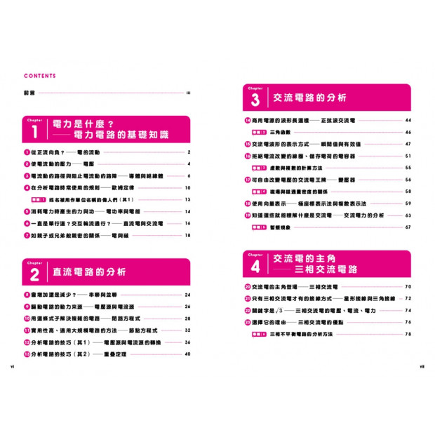 學習電力電路時,不只可以知道電通過的「路徑」、在路徑上的「流動情況」,也會瞭解到電流通過時如何作功。也就是說,我們可以透過電力電路瞭解電力的各種應用方法。另外,電與磁之間的關係相當密切,所以我們在本書中也會稍微跨足到磁學領域。