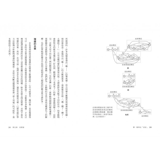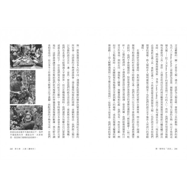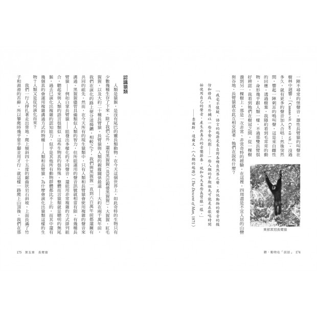 ????作者還與研究團隊遠赴越南山區的偏僻叢林,考察罕見的長臂猿奇妙的歌聲:這種猿類是否可能以殊別的歌唱方式,針對諸如豹、蛇等不同天敵,發出有所區別的警告?