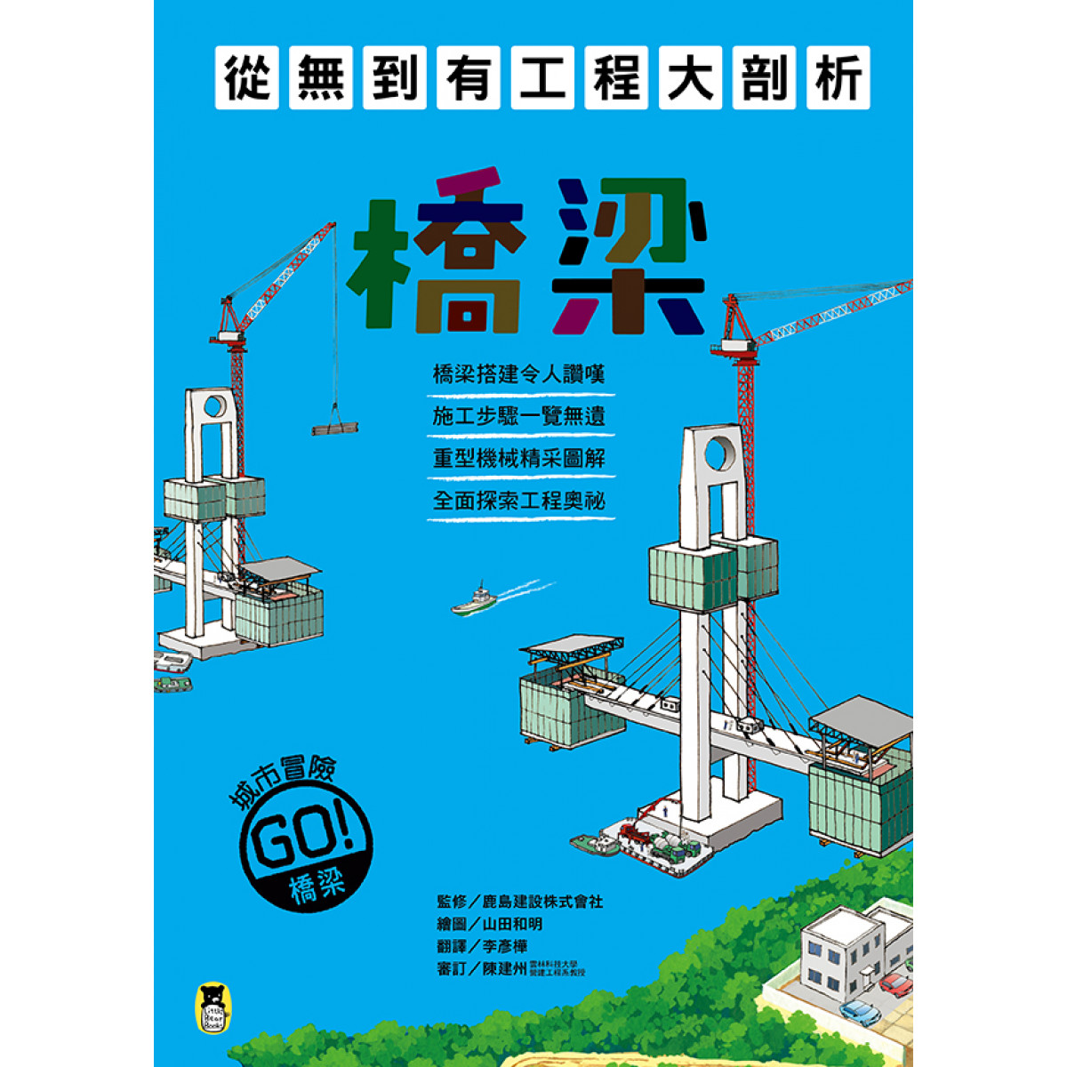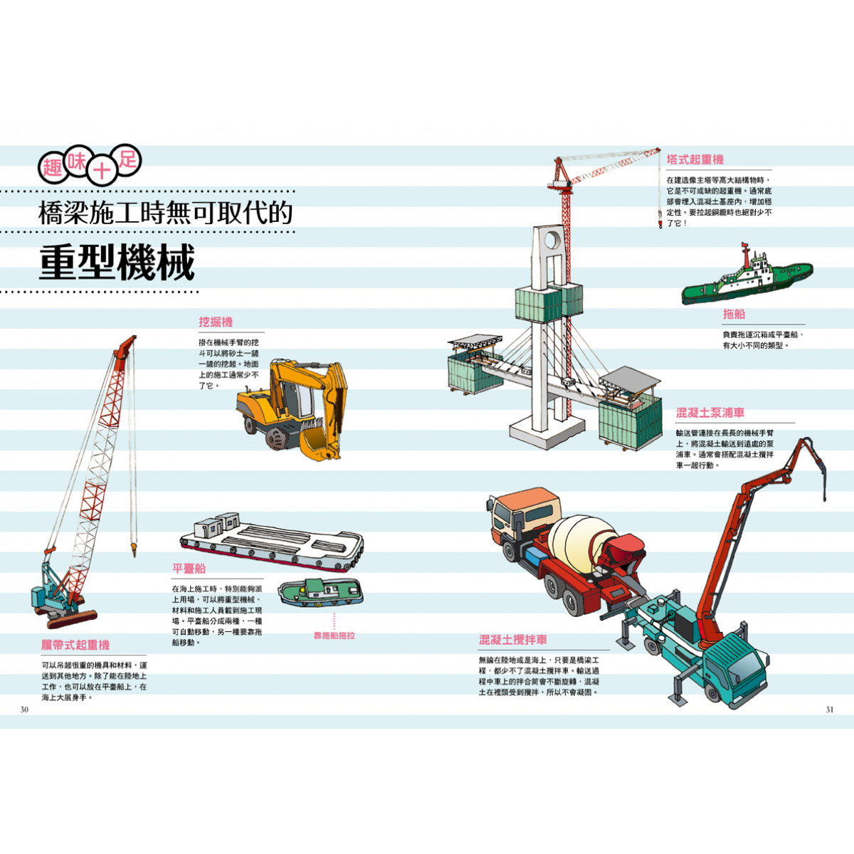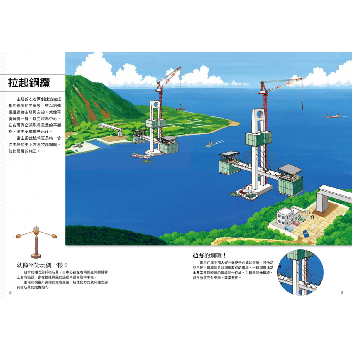 本書透過充滿童趣又詳細紀實的大跨頁插圖,真實呈現橋梁搭建的施工細節,還能看見移動式工作車、平臺船、混凝土泵浦車等大型機具大顯身手,宛如親臨施工現場!為了支撐橋體,必須在橋梁兩端的陸地上建造橋臺;主塔和主梁建造完成後,會以斜張鋼纜連接,就像平衡玩偶一樣,取得左右重量的平衡點,將主梁牢牢懸吊住……