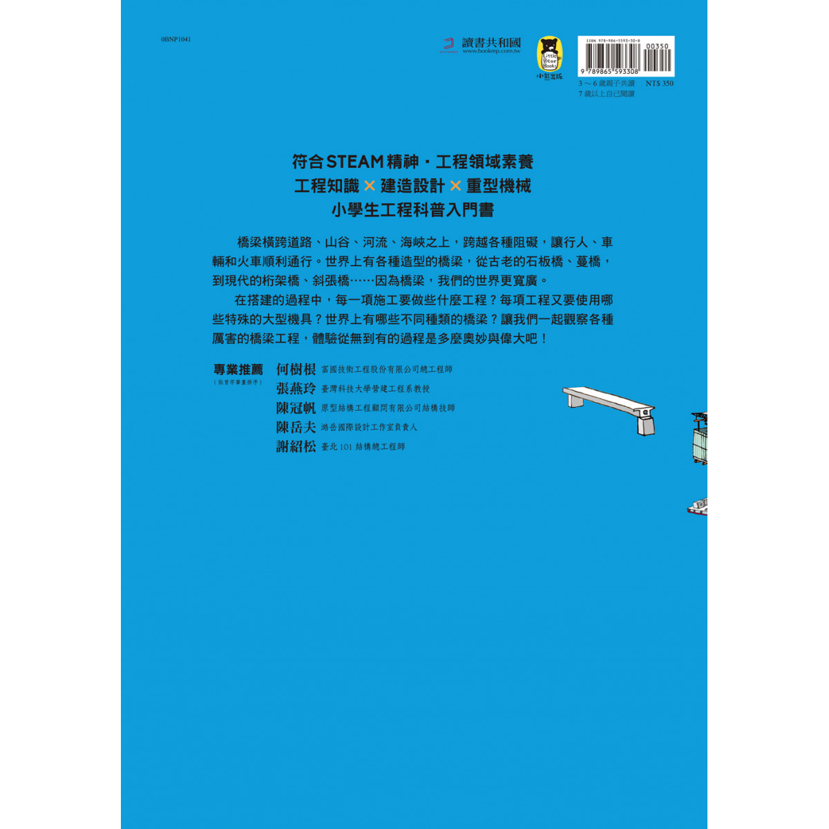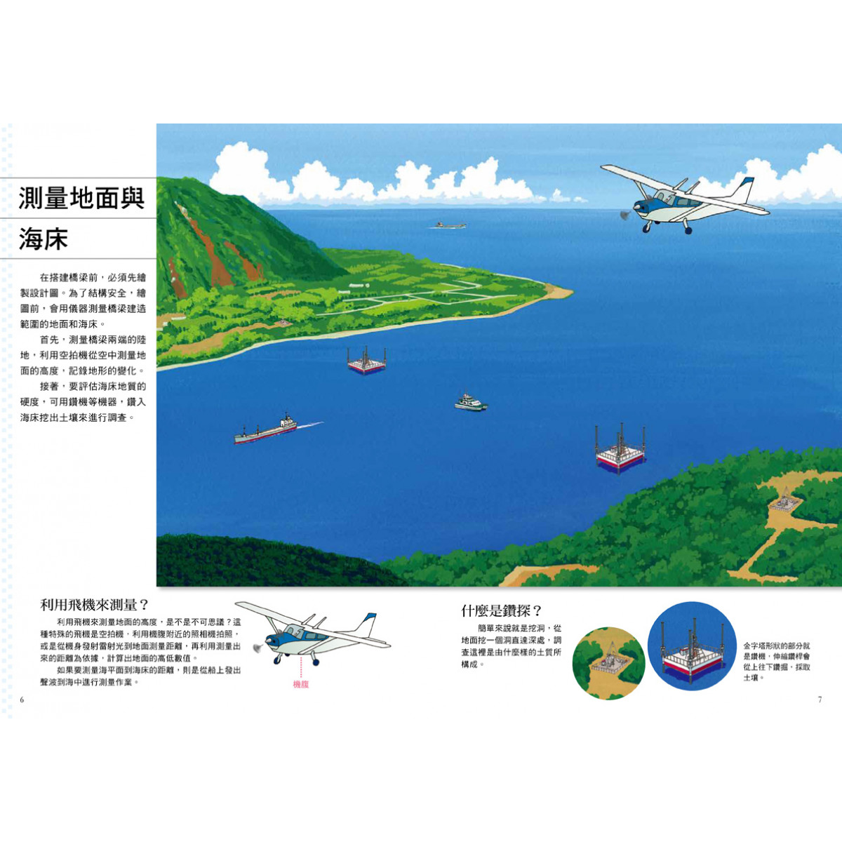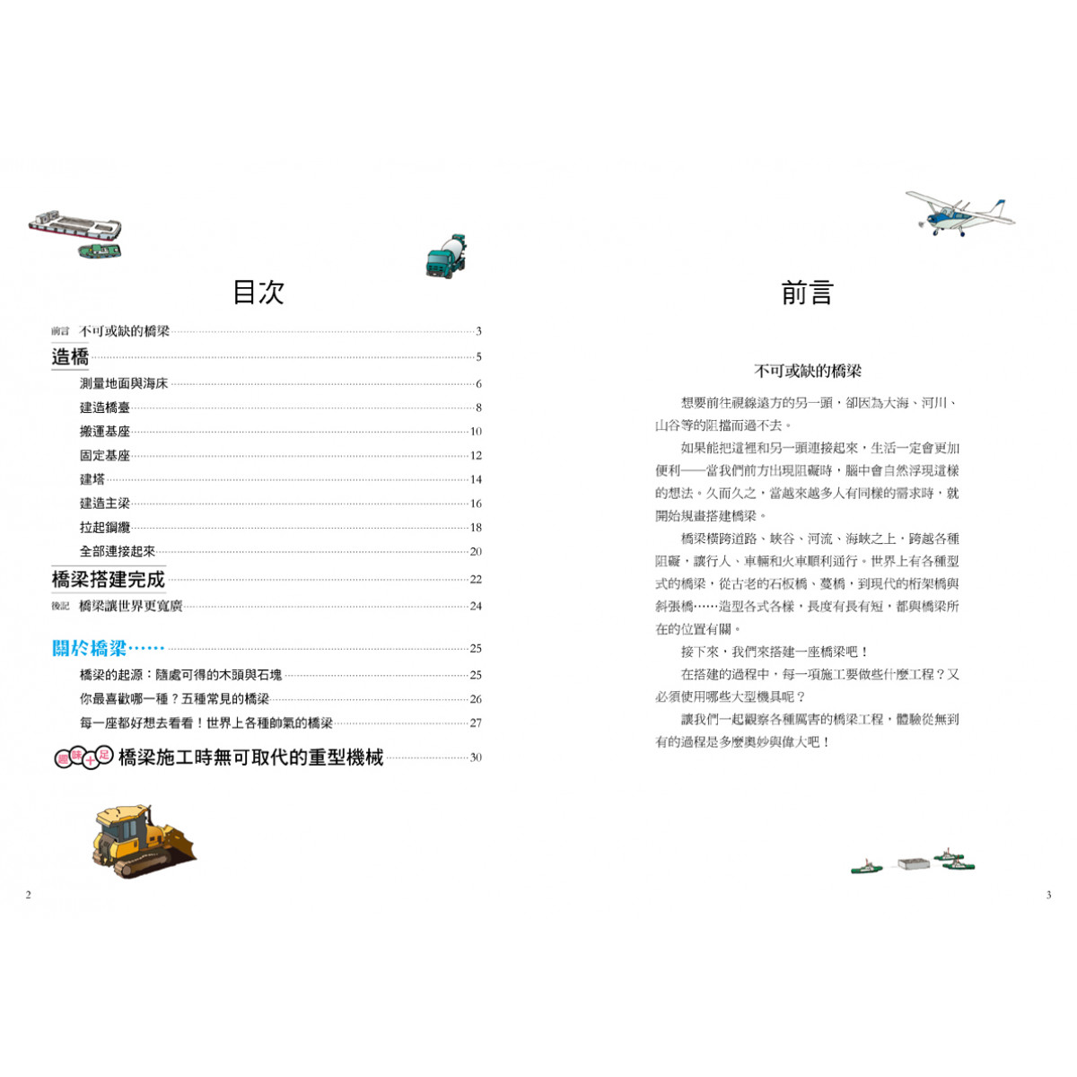 橋梁建造的過程中,每一項施工要做些什麼工程?每項工程要使用哪些特殊的大型機具?世界上又有哪些不同型式的橋梁?每一個步驟都用大跨頁圖介紹,直實呈現橋梁建造工程的細節,讓孩子清楚了解相關的工程知識,啓發孩子對科學與工程探索的樂趣,是一本大人與小孩都愛的工程繪本。