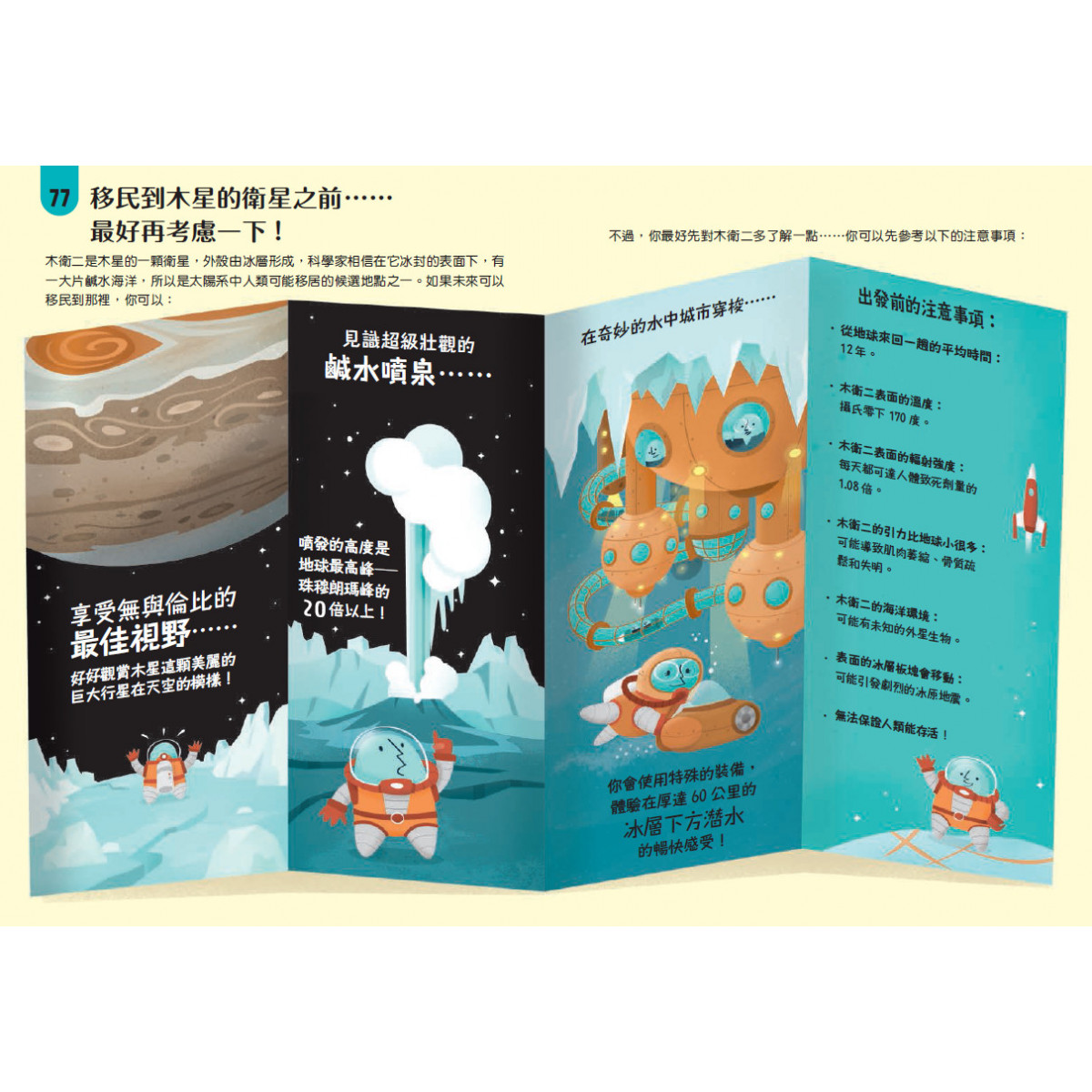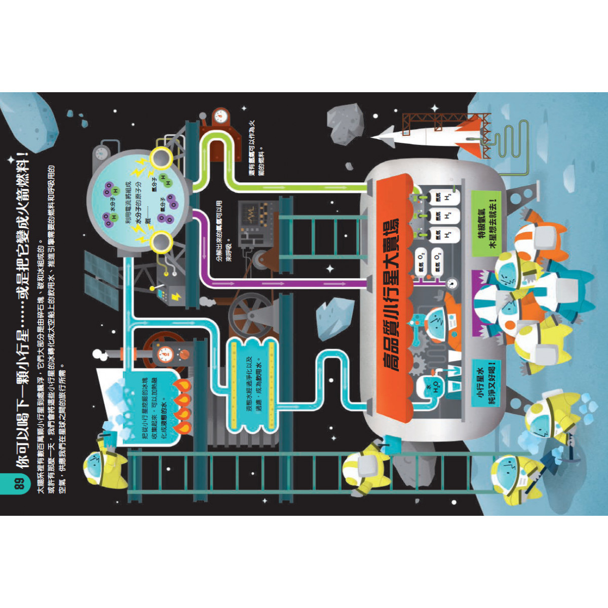 書中用多元方式呈現這些宇宙大小事,除了有可愛插圖和對話說明知識,