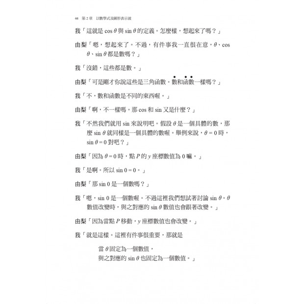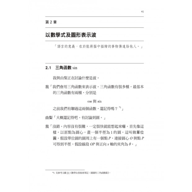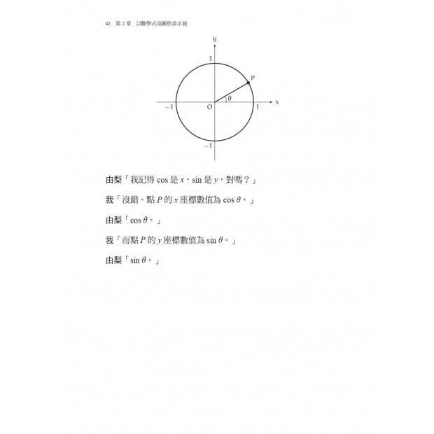 在第2章「以數學式及圖形表示波」中,您將學習如何使用三角函數來表示波。 書中許多具體圖形並研究波的數學式,從而瞭解使用三角函數並不困難。透過本章,可以學習用弧度表示的角度、cos和sin的定義及波的數學式和波的疊加。