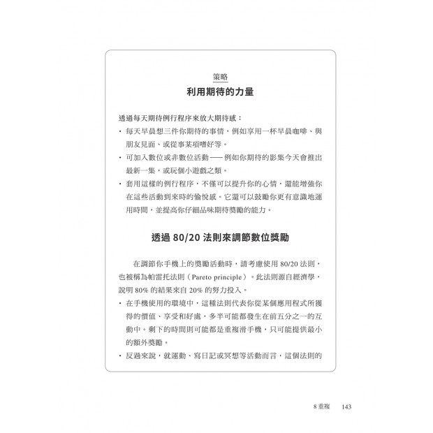 習慣是自動駕駛的,會繞過執行大腦的意識決策過程,這就表示即使像早上查看社群媒體的習慣會讓你上班遲到,你也可能會繼續這樣下去。到底是什麼原因造成我們感到所謂的「缺乏意志力」而淪入習慣行為呢?簡單地說,我們的意志力程度並非恆定,而是不斷變化。最好的比喻就是把你的執行大腦想像成一顆電池,當電池充滿電,就會感到精力充沛,準備好實現你的目標。而當電池耗盡時,情況便反過來。例如在疲憊狀態下,你無法鼓起所需的精神能量來完成困難的任務,而會選擇簡單的選項。這些對於簡單選項的選擇,就形成了「無意識的習慣」,因為這樣做最舒服,執行大腦得以休息,不浪費腦力。作者在這種幾乎無法挽回的情況下,伸出神經科醫師的援手,提供各位多種實用策略,幫助讀者能夠有意識地改善習慣,控制自己的習慣行為。例如:「五分鐘法則」:每當有滑手機的衝動時,先延遲五分鐘再行動。這種延遲可以讓大腦的執行功能介入,使你的習慣行為從自動駕駛模式,轉變為有意識的決定。又如「環境調整」:減少手機在視線範圍內的時間,例如將手機放在包包或不同房間,以降低使用頻率。這些臨床診斷上所採取的實用應變措施,都能幫助你利用意想不到的小方法,巧妙閃避自己的習慣動作,變成有規劃的習慣行為。