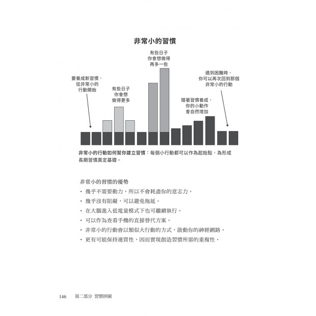 第二部分深入探討形成「習慣」背後的複雜腦神經科學。作者介紹了獨特的方法論:「習慣拼圖」。闡述在人體大腦中建立和植入習慣必備的四個基本要素,包括「提醒:啟動行為的觸發點」、「非常小的行動:容易持續的行動」、「獎勵:讓大腦內化學反應強化習慣」與「重複:持續練習,讓習慣變得自動化」等。此部分的探索將會以詳細的「實用指南」作為總結,提供各位實用的工具和策略,以重新改變那些積弊已久的不良習慣。