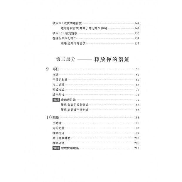 最後,作者將深入探討焦慮、睡眠、心理健康和社群媒體等具體領域,檢視它們跟使用手機以及數位世界之間的複雜關係。根據你在前兩部分所獲得的知識,便可針對本身特別困難的領域,進行處理和解決。這種做法讓你得以批判性地檢視這些具體領域與使用手機之間的關聯,藉以制定個性化的改進策略,進而解鎖大腦的完整潛力。本書最後這個部分,也同樣專注於對大腦的保護,讓你的可以把認知健康保持在最佳狀態。