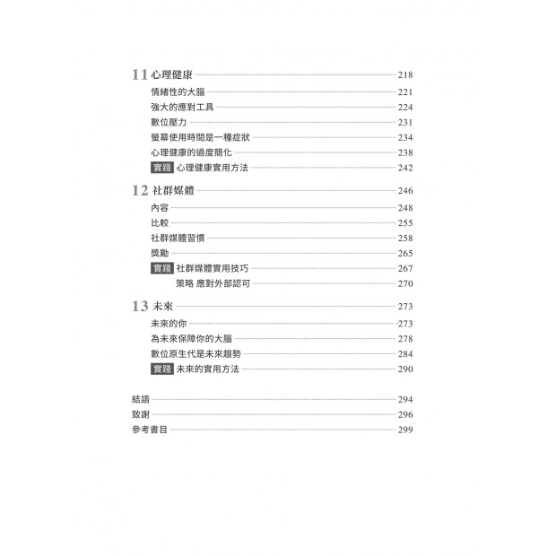 最後,我將深入探討焦慮、睡眠、心理健康和社群媒體等具體領域,檢視它們跟手機使用以及數位世界之間的複雜關係。根據你在前兩部分所獲得的知識,便可針對本身特別困難的領域,進行處理和解決。這種做法將讓你可以批判性地檢視這些領域與科技的關聯,制定個性化的改進策略,從而解鎖你的完整潛力。本書最後這個部分,專注於未來時對於大腦的保護,指導你如何在未來的數位挑戰中,把你的認知健康,保持並增強在最佳狀態。