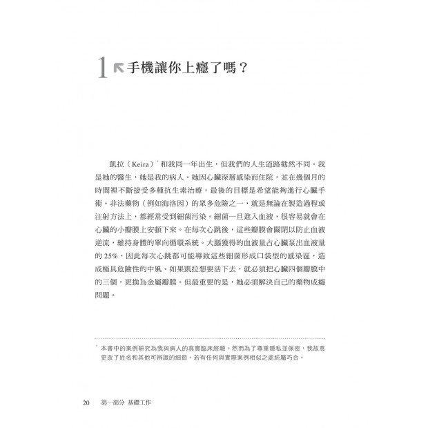 本書的目的並不是要妖魔化手機,而是希望幫助讀者了解手機使用習慣背後的大腦機制,進而建立健康的數位習慣。透過本書,你將學會如何與手機和平共存,讓手機成為你的得力助手,而非阻礙,把對手機成癮的恐懼,轉化為知識、成長和積極行動。現在,就請各位讓這本引人入勝的書,帶領我們深入探索大腦運作與數位成癮之間的複雜關係。即使你沒有任何手機成癮的問題,理解大腦的運作機制,也能讓你受用無窮。