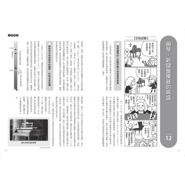 兒童音樂教育第一品牌──日本山葉音樂Yamaha出版社,將複雜的音樂發展脈絡、作曲家生平故事、各時代的文化背景,都融入到輕鬆易懂的圖像敘事中。四格漫畫精心設計,幽默開場,保留了學術的嚴謹性,更增添閱讀的樂趣,讓學習音樂史成為一種享受。