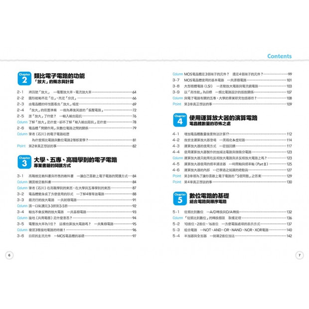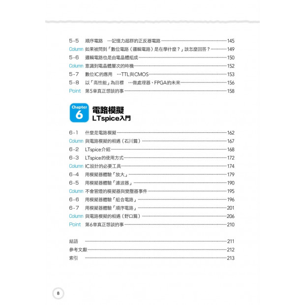 然而,也有不少讀者透過這本書入門電子電路領域。在我與這些讀者討論相關內容時,我覺得對話相當順暢。用這本書上課時,我也覺得只要說個大概,學生就會自動自發地去找相關資料,還會指出我黑板上寫錯的內容。因此,吐槽也是本書的重點之一。就這點看來,本書Column內容或許還比正文重要,請把這些內容當成趣談、閒話,輕鬆地看過去。不管讀者是其他專業領域人士、高中生、科大生、大學生,還是社會人士,如果本書能讓你們瞭解到電子電路領域的關鍵字,對這個領域產生興趣,那就太棒了。