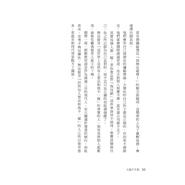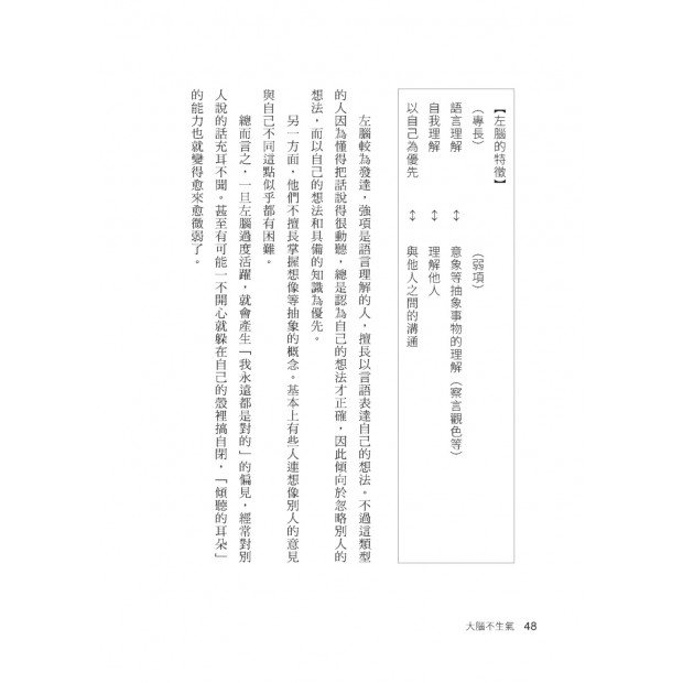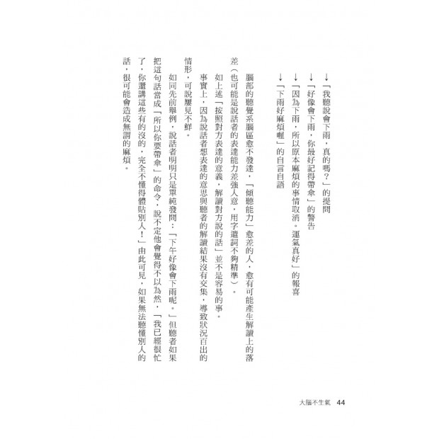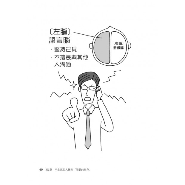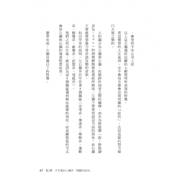 2.透過對專業人士的腦部掃描,得知不生氣的秘訣,與生氣的「方法」:專業人士大多「聽覺系腦區」發達,善於聆聽與理解他人語句,然而在必要時也能透過冷靜地斥責來引導事情往正確的方向前進。本書將會透過腦科學與實際觀察,告訴你如何透過腦科學進行情緒管理,使事情能更順利進行。