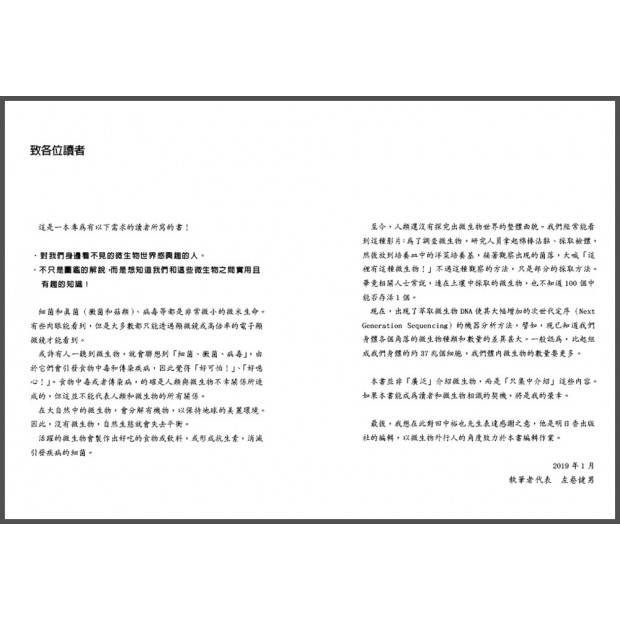 本書旨在幫助讀者釐清微生物的種類與特性,像前述有會危害人體健康生命安全的微生物,也有分解有機物來保持地球美麗環境,維護生態平衡的微生物,更有製作出好吃的食物或飲料,或形成抗生素,消滅引發疾病細菌的微生物,讀者瞭解之後就不會聞微生物色變,並避免真正有害的微生物,讓生活更加安全且多采。