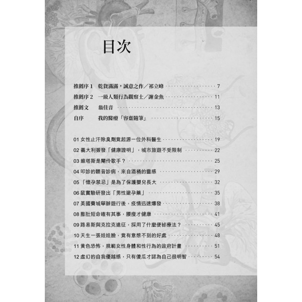 在這本《怪奇醫學研究所》中,蘇醫師選擇了70幾則醫學史上的故事,用隨筆般輕巧靈活的筆觸,把那些有趣的時刻與決斷清楚地勾勒出來。 ——謝金魚