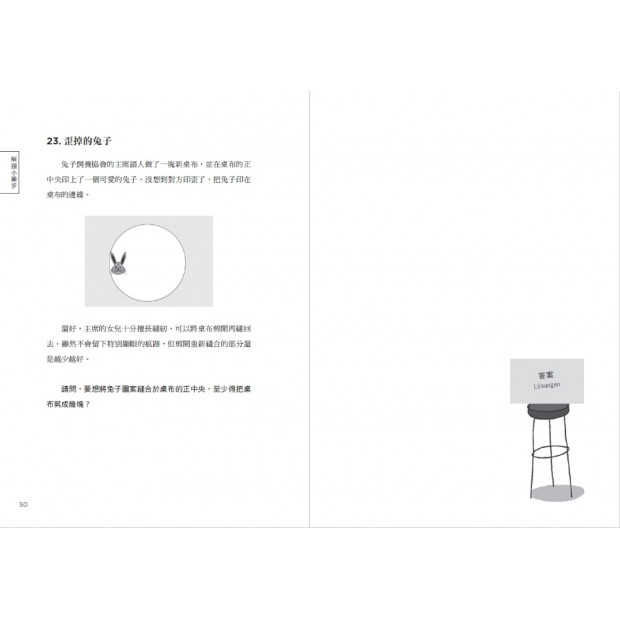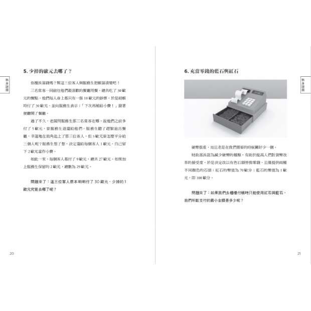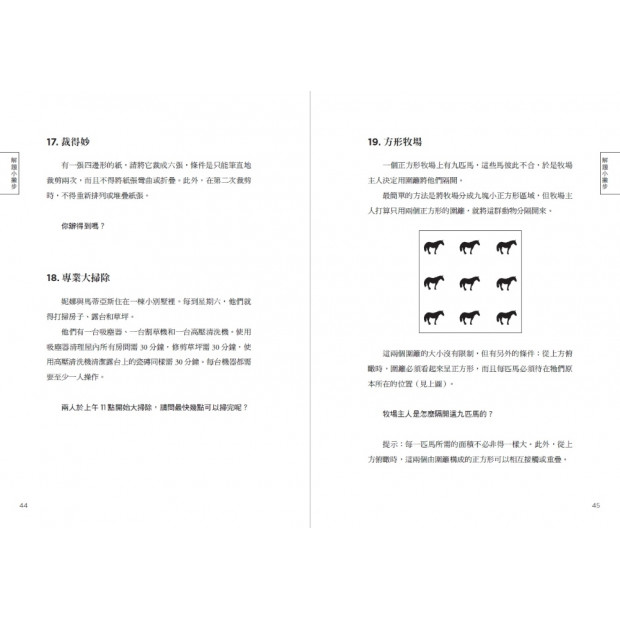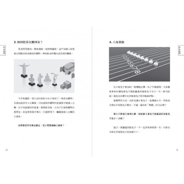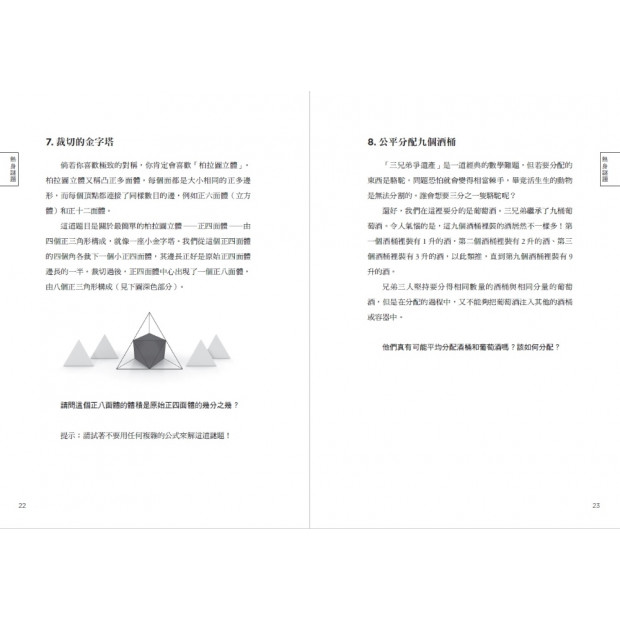 無論如何,現在輪到你上場了!在這本書中,你將遇見關於邏輯、幾何和組合數學的一百道謎題。萬一你被某道難題卡住,請不要太快就放棄了。不妨暫時把它擱到一邊,先去解決另一道謎題。也許到了隔天,靈光一現,你就會想出絕妙的解題方法。