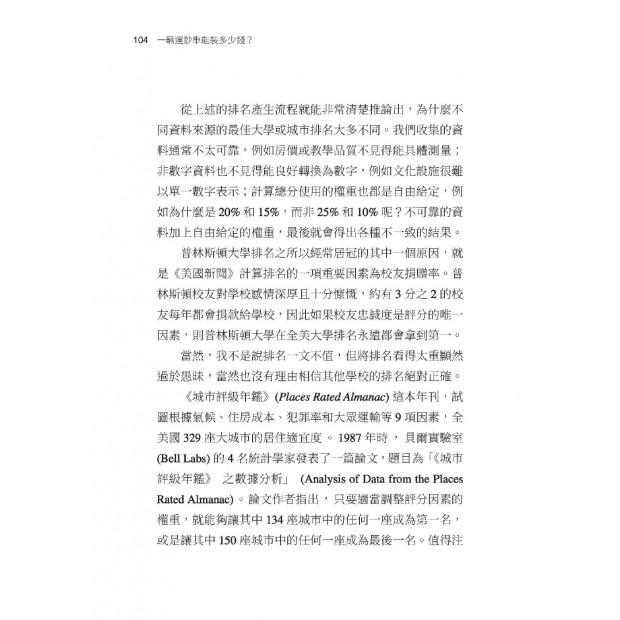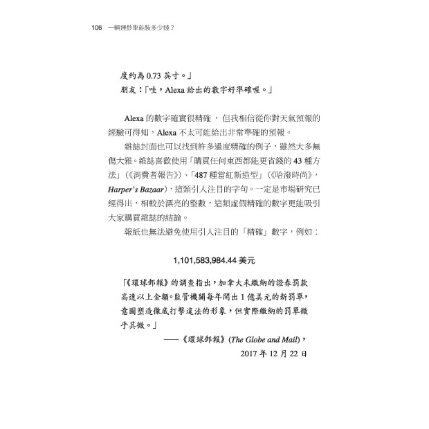 例如,當你卡在高速公路的車陣中動彈不得,心情煩悶地咒罵:「搞什麼,今天是不是所有人都把車子開出來了啊?」的同時,會不會也好奇路上到底有多少車子?除了上網查資料外,是否有一個簡單的估算方法?作者在書中一步一步演示了自己如何估算出答案。因為過程中沒有運用很艱深的數學原理,而且作者的思路出奇的簡單,我馬上試著模仿了一下,來算算臺灣有多少汽車。